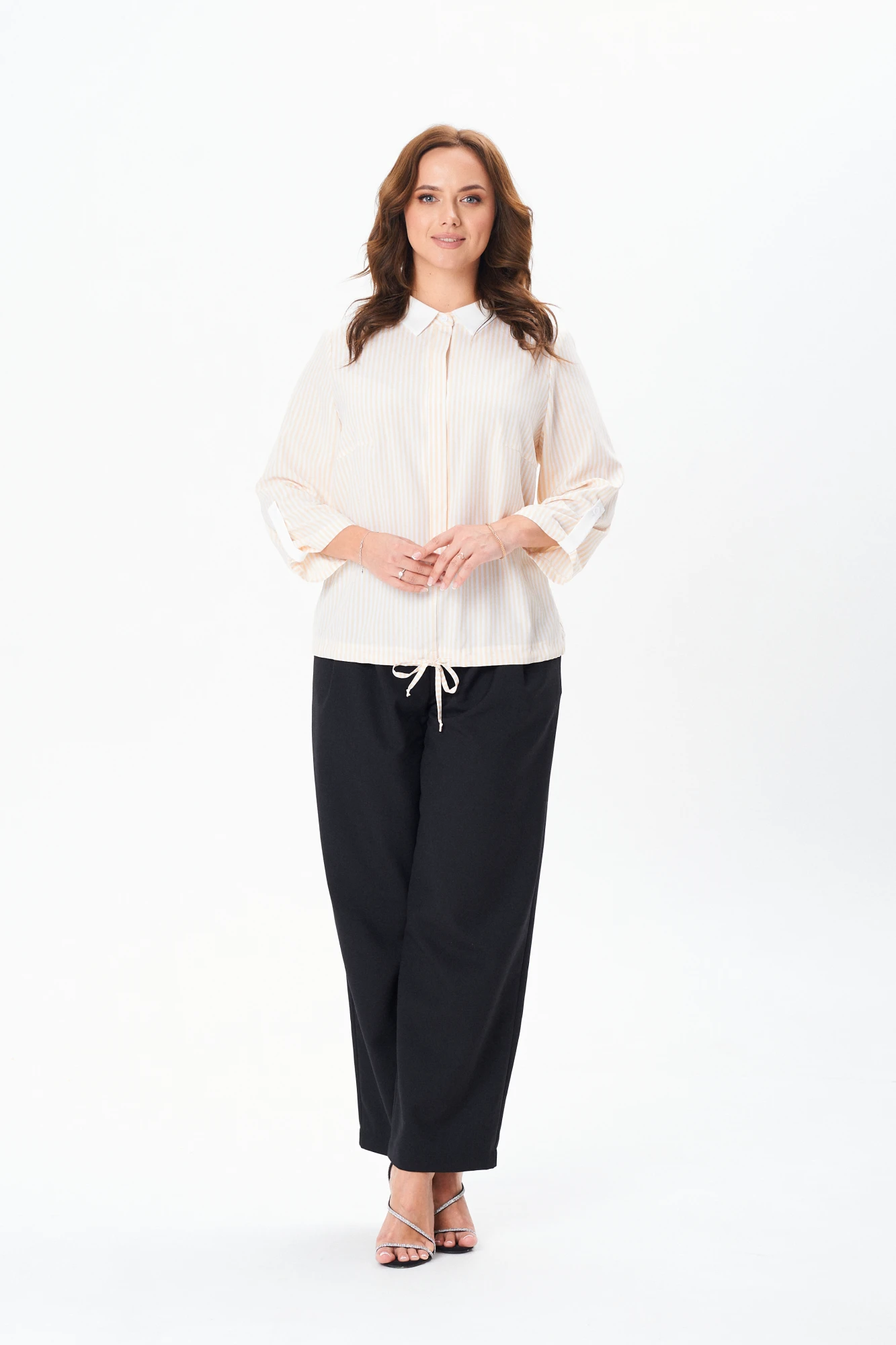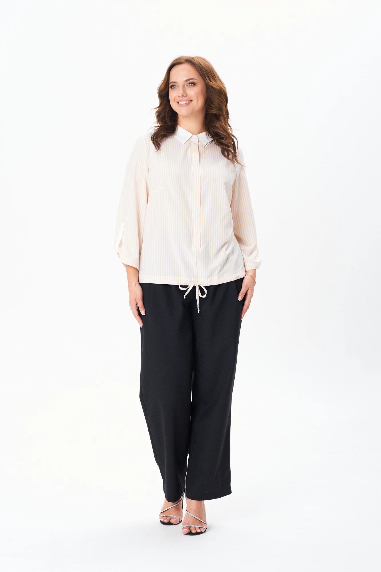 Женская рубашка свободного кроя с в тачным рукавом и рубашечным воротником. Рукав изделия, длинной 7/8 с манжетой, закрепленный патой на пуговицу. Перед изделия с нагрудными вытачками и супатной застежкой на петли пуговицы. Спинка блузки цельная. По низу изделия кулиса со шнуром для регулирования ширины.