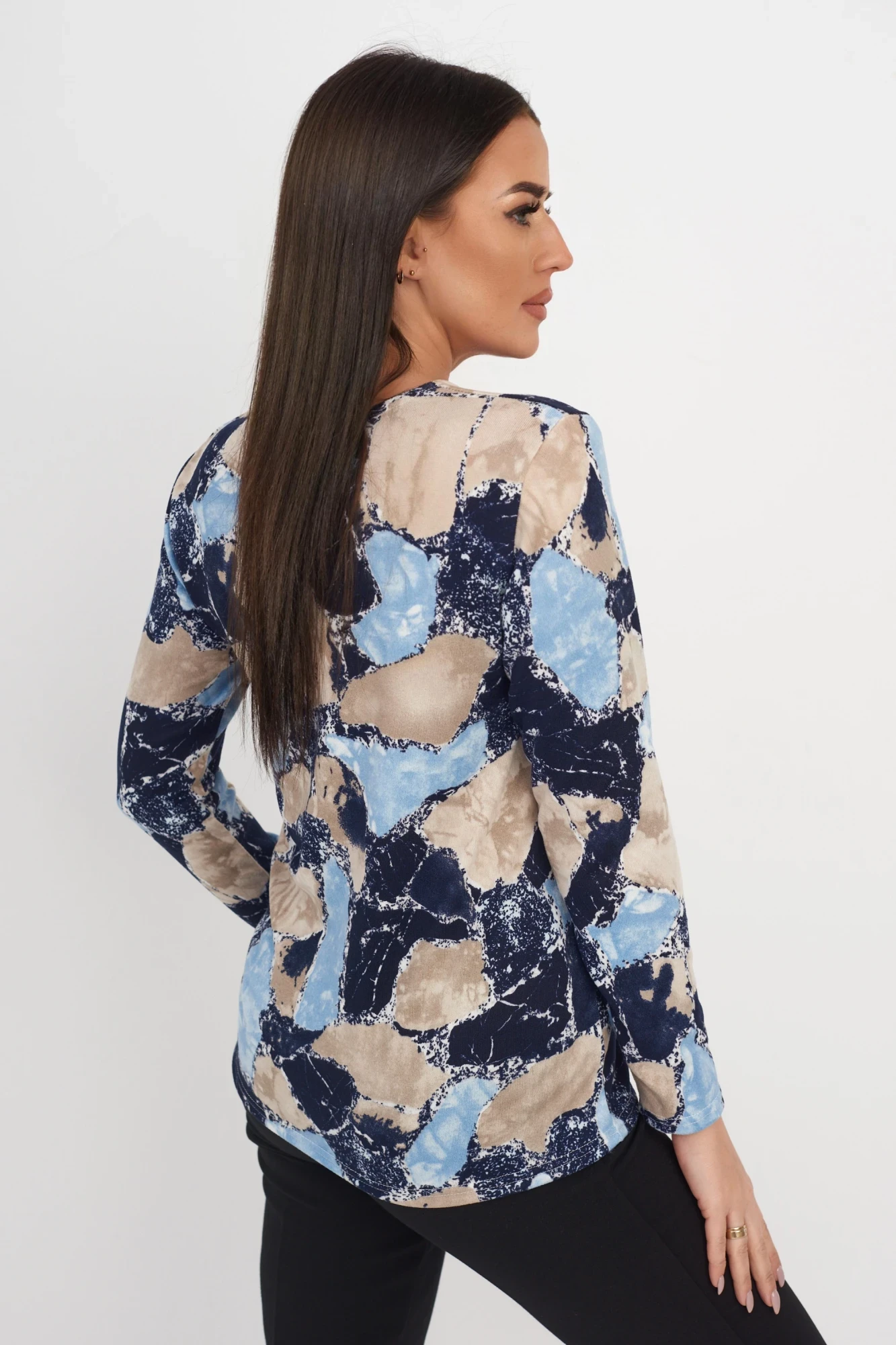 Блузка теплая прямого силуэта с круглым вырезом горловины. Визуально удленяет шею. Рукава втачные, длинные. Ткань акрил с эластаном. Практичная. Яркий дизайн. Хороший пошив и посадка.Будет смотреться в комплекте с брюками классическими, джинсами и с юбкой, каждый раз помогая Вам создавать новый неповторимый образ.