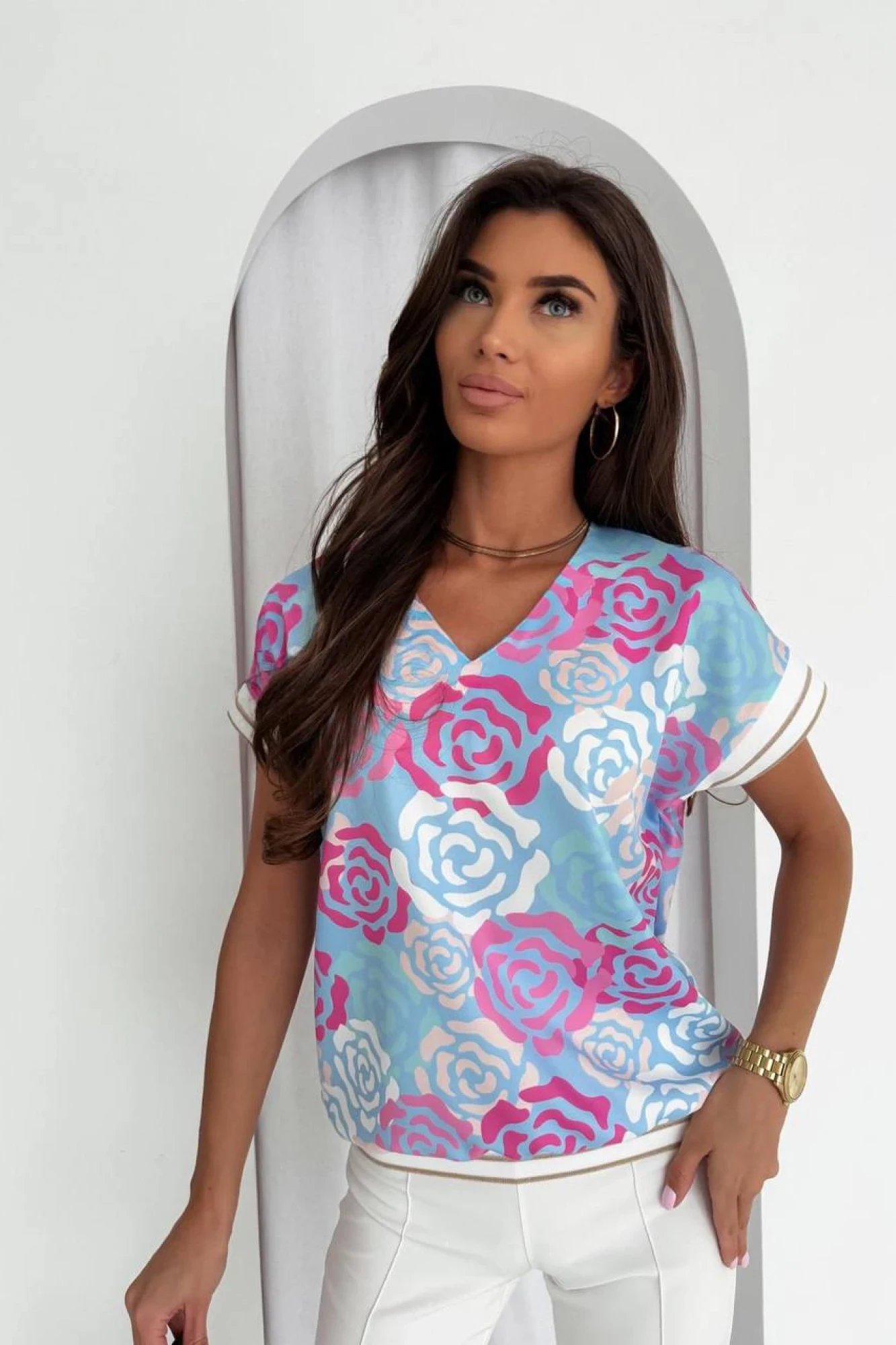 Основные особенности блузки: короткий рукав с манжетой со спущенной линией плеча, V-образная горловина , зрительно вытягивает шею, резинка по низу блузки. Свободный крой способствует хорошей посадке и подходит и стройным и полным девушкам.