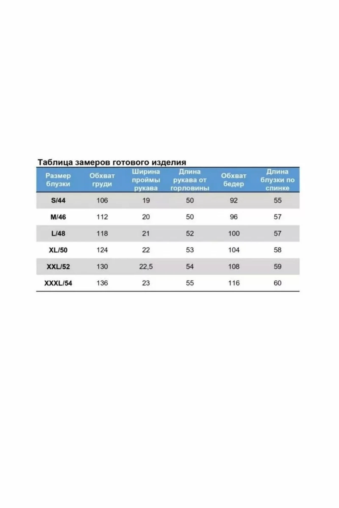 Добрый день! Длина блузки по спинке увеличивается с увеличением размера. S - 44 российский размер - 55 см M - 46 российский размер - 57 см L - 48 российский размер - 57 см XL - 50 российский размер - 59 см XXL - 52 российский размер - 59 см XXXL - 54 российский размер - 60 см