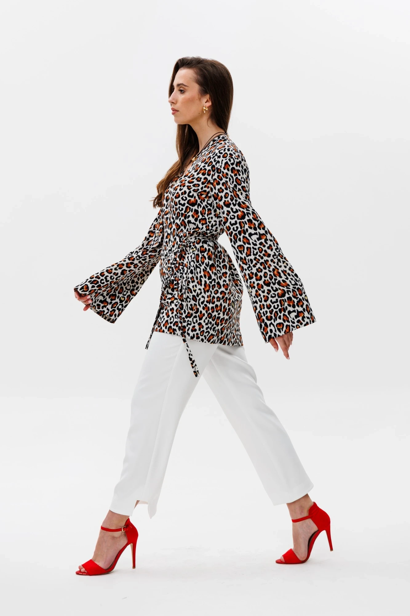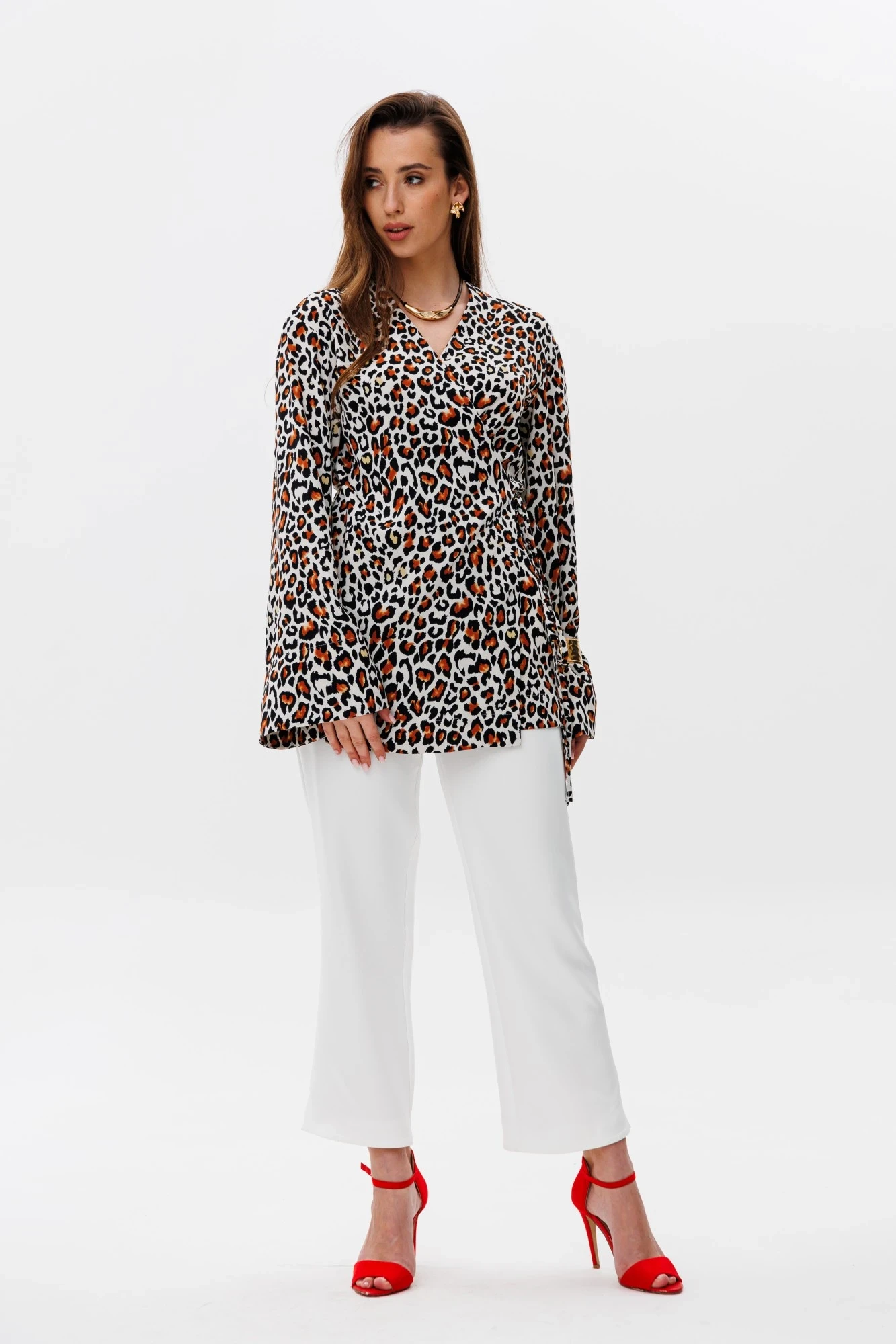Блуза назапах умеренного свободного прямого силуэта. На деталях переда нагрудные вытачки, переведенные в боковой шов. На детали спинки плечевые вытачки переведены в срез горловины. Вырез горловины глубокий, V-образной формы. Линия плеча расширена. Рукав длинный, втачной. Блуза завязывается двумя поясами, притачанными к бортам полочек.