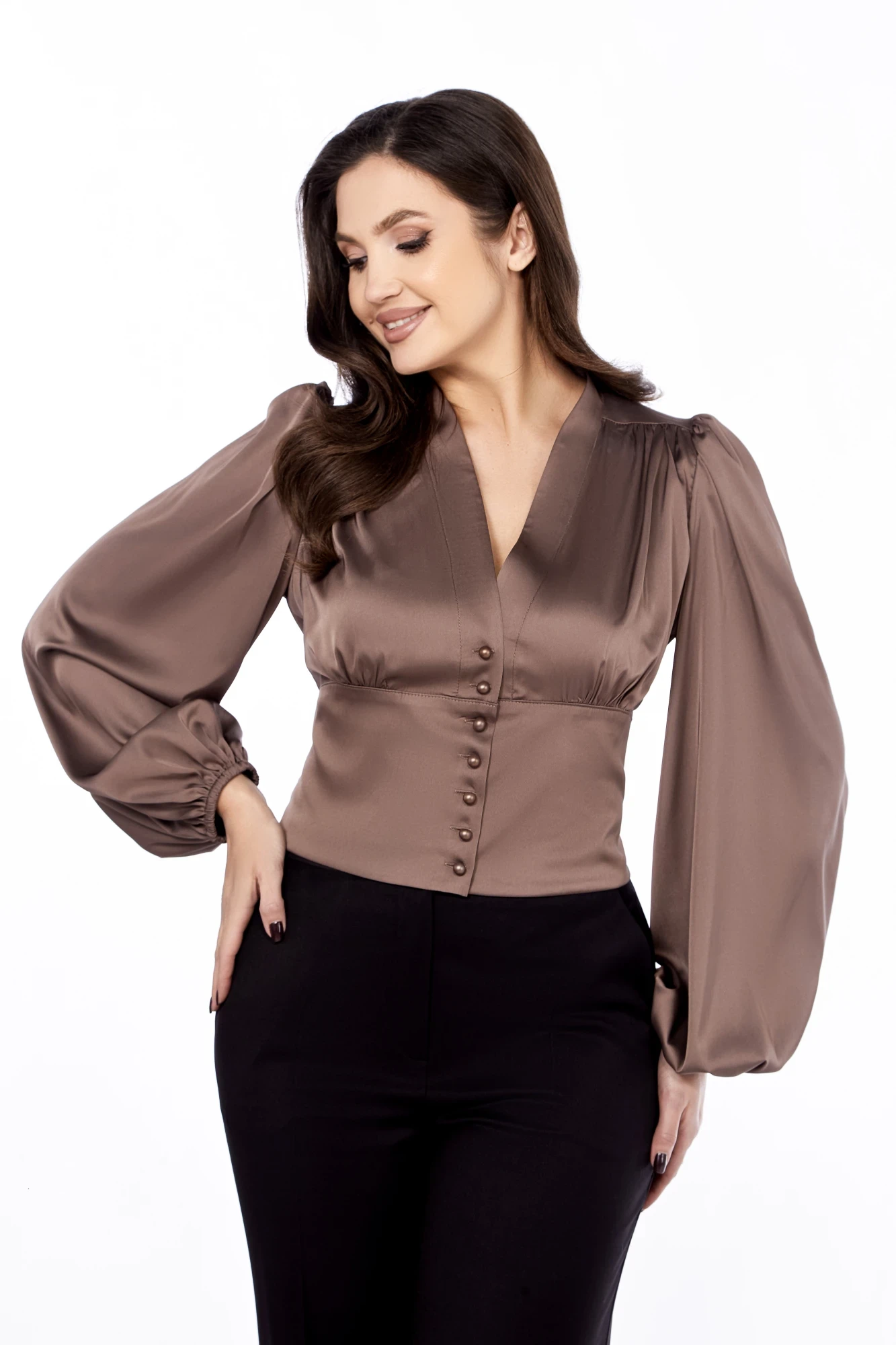 Блузка нарядная, полуприлегающего силуэта из струящейся ткани, с застежкой на планке на петли и пуговицы. Сборка по полочке от плеча, подрез под грудью, в верхней части сборка. Нижняя часть спинки собрана на венгерку. Рукав втачной широкий, длинный, со сборкой от плеча, а низ собран на резинку.