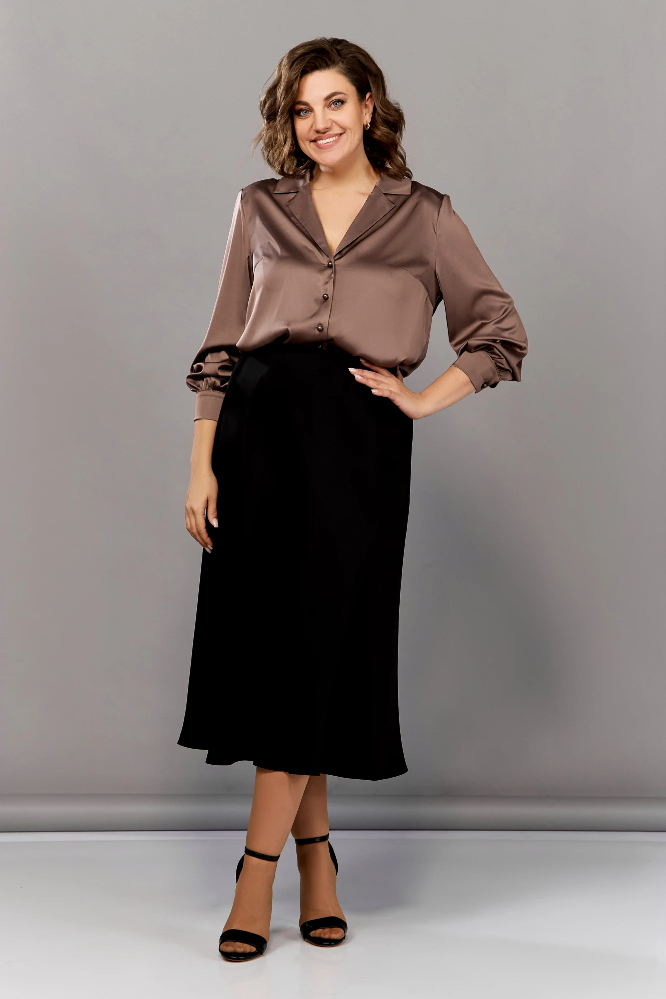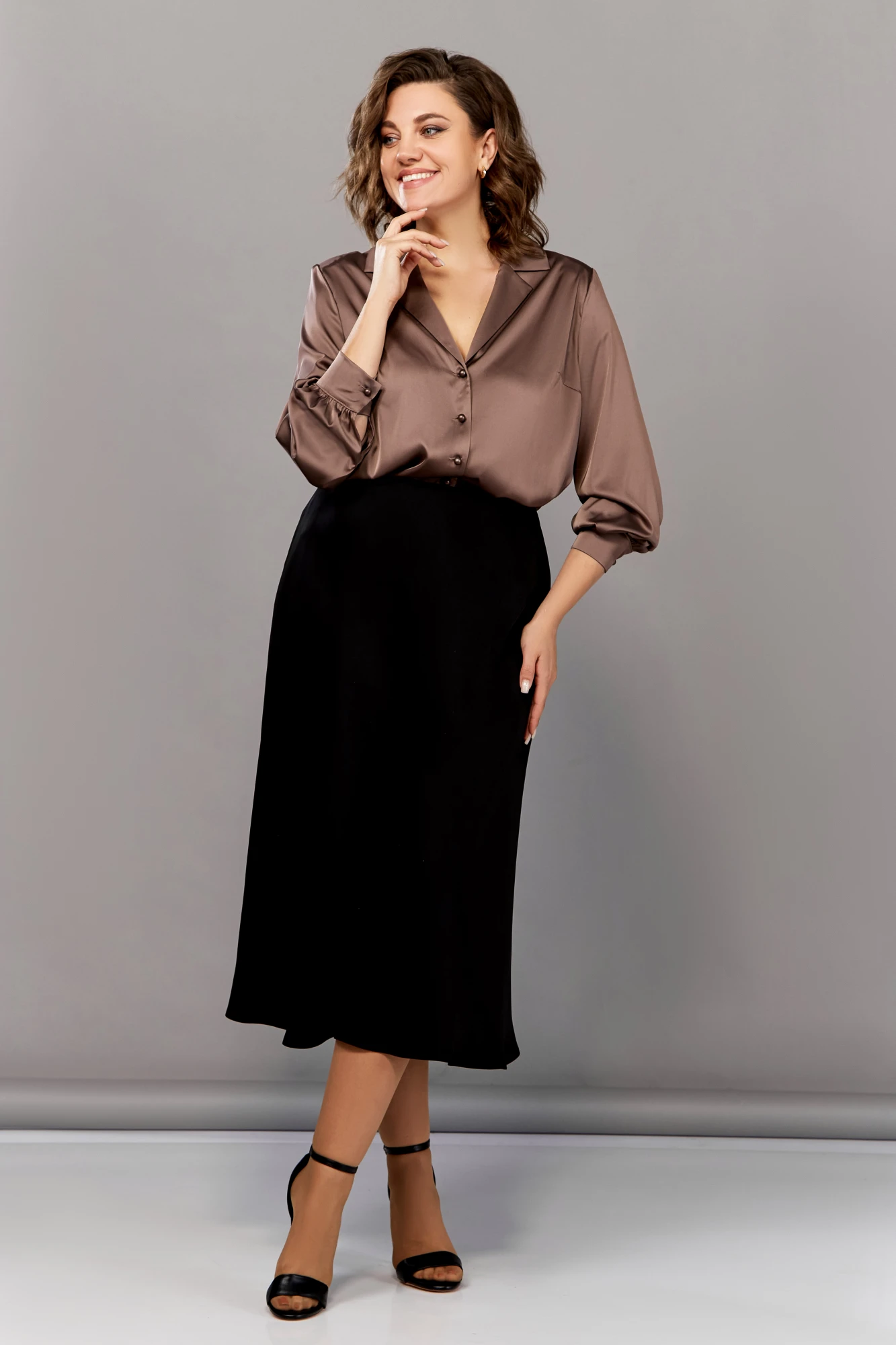 Блуза прямого,свободного силуэта с воротником пиджачного типа и застежкой на пуговицы. На полочке нагрудные вытачки. Рукав втачной, длинный. на манжете, одношовный. Длина блузы 60 см, длина рукава 62см.