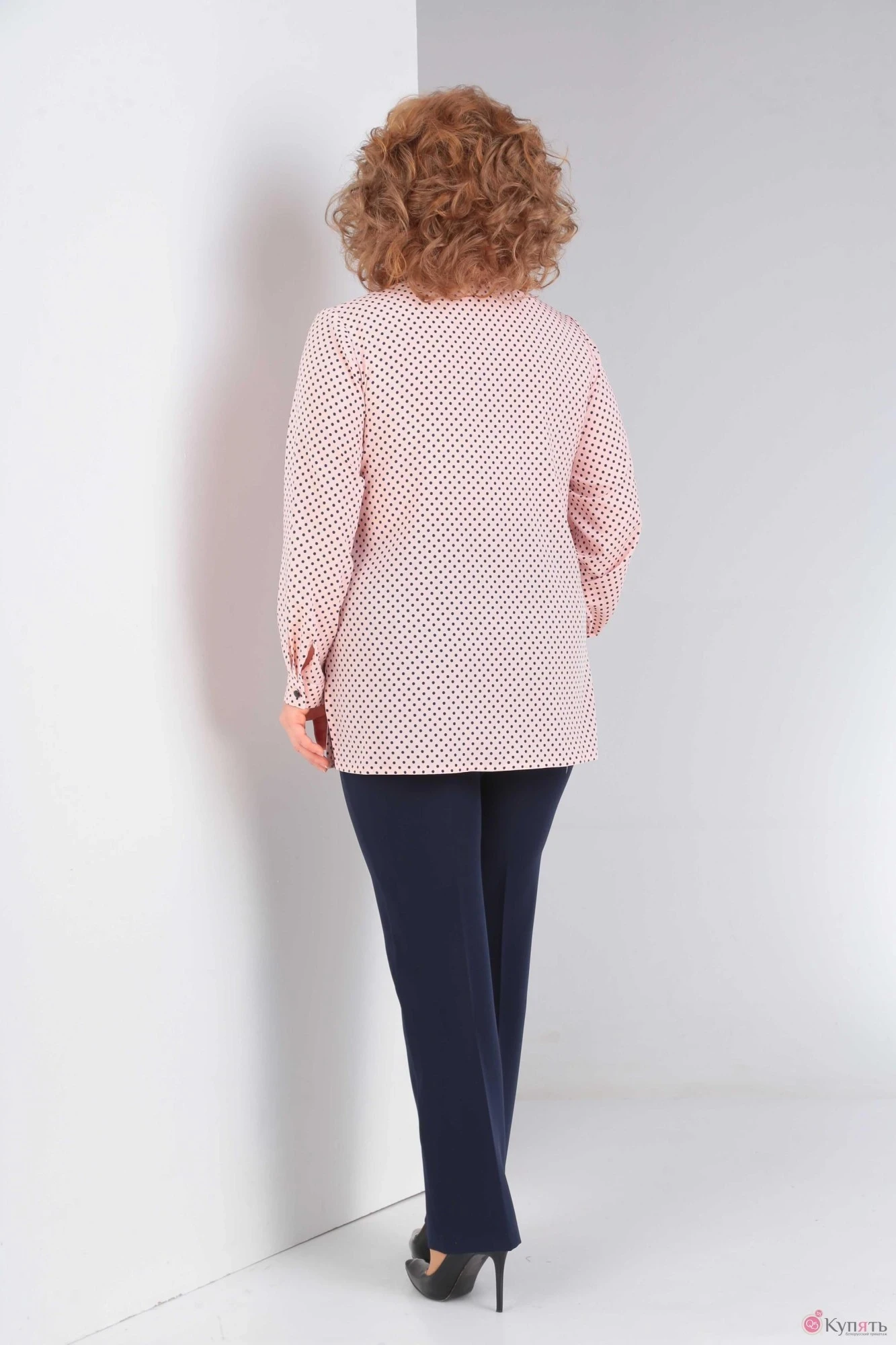 Блуза выполнена из блузочной ткани. Блуза полуприлегающего силуэта с центральной бортовой застежкой на 7 пуговиц. Перед блузы с нагрудными вытачками, вырез V-образной формы со стойкой, переходящей в бант. Рукав длинный, на манжете с пуговицей.
