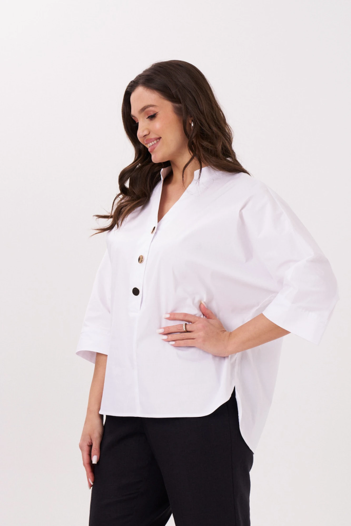 Блузка офисная свободного кроя со спущенной линией плеча. Перед с воротником-стойкой и V-образным вырезом, подчеркнутым блестящими пуговицами на центральной застежке. Блузка летняя женская украшает аккуратный закругленный низ, разрезы в боковом шве и удлиненная спинка с пришивной кокеткой и складкой. Это обеспечивает идеальную посадку на плечах.