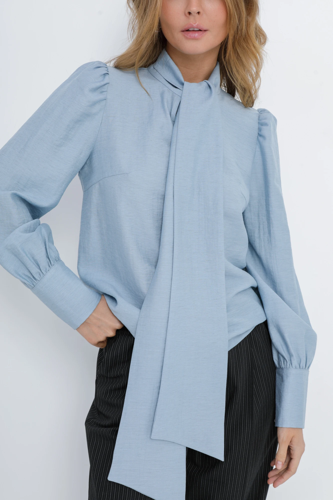 Блуза из полупрозрачной вискозы с воротником-бантом. Детали: прямой силуэт, нагрудные вытачки, рукава длинные объемные со сборкой и высокими притачными манжетами с застежкой на навесные петли и декоративные пуговицы, блуза без застежки. Длина по спинке около 59,5 см в размерах 40-46 и около 61,5 см в размерах 48-52, длина рукава около 63 см