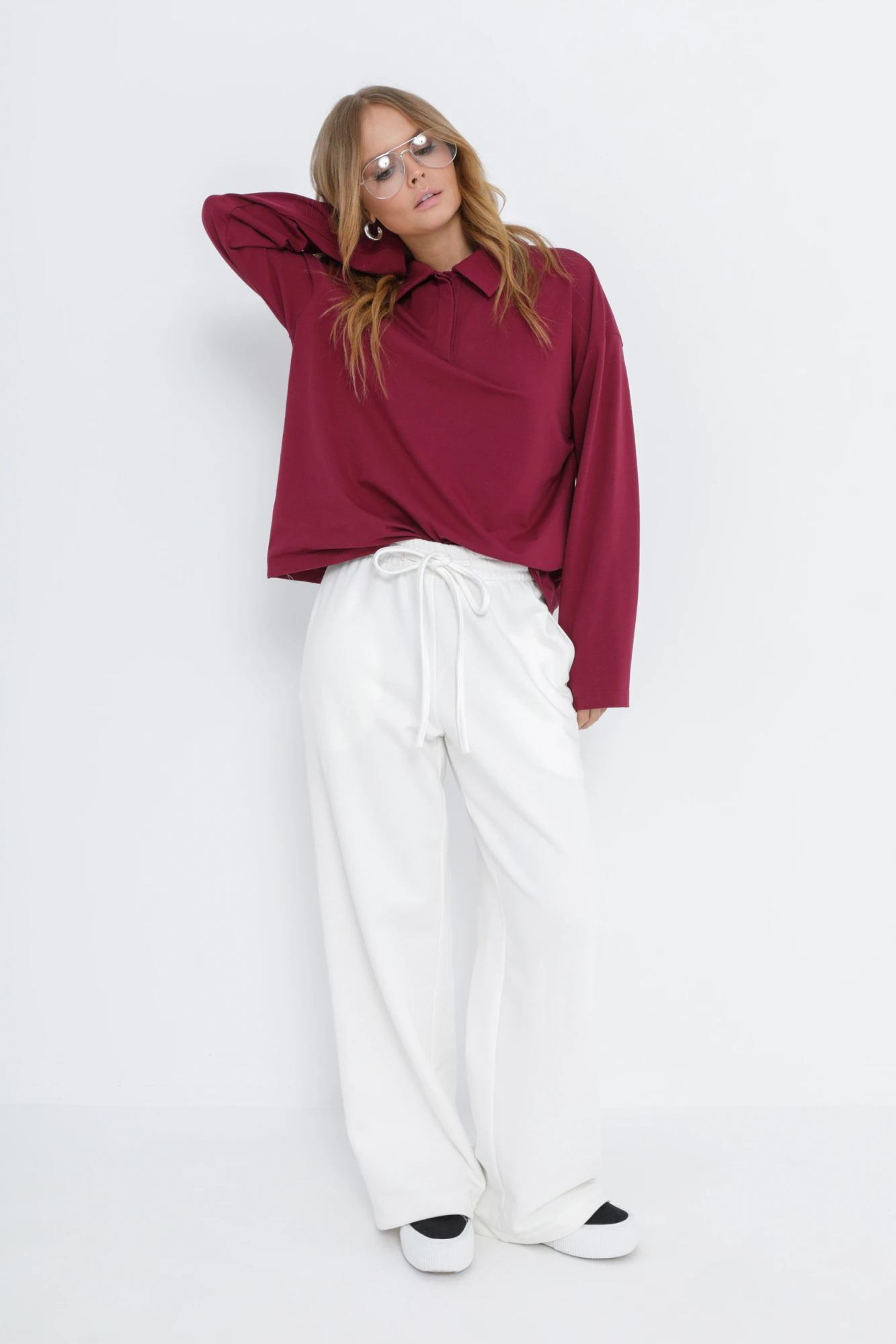 Хлопковое поло Детали: поло прямого силуэта, спущенная линия плеча, потайная застежка на петли и пуговицы, длинные рукава. Длина поло по спинке около 58 в размерах 40-46 и около 60 см в размерах 48-52, длина рукава+ плечо около 51,5+9 см. Длина брюк по боковому шву с поясом около 105 см, длина брюк по внутреннему шву около 78 см.