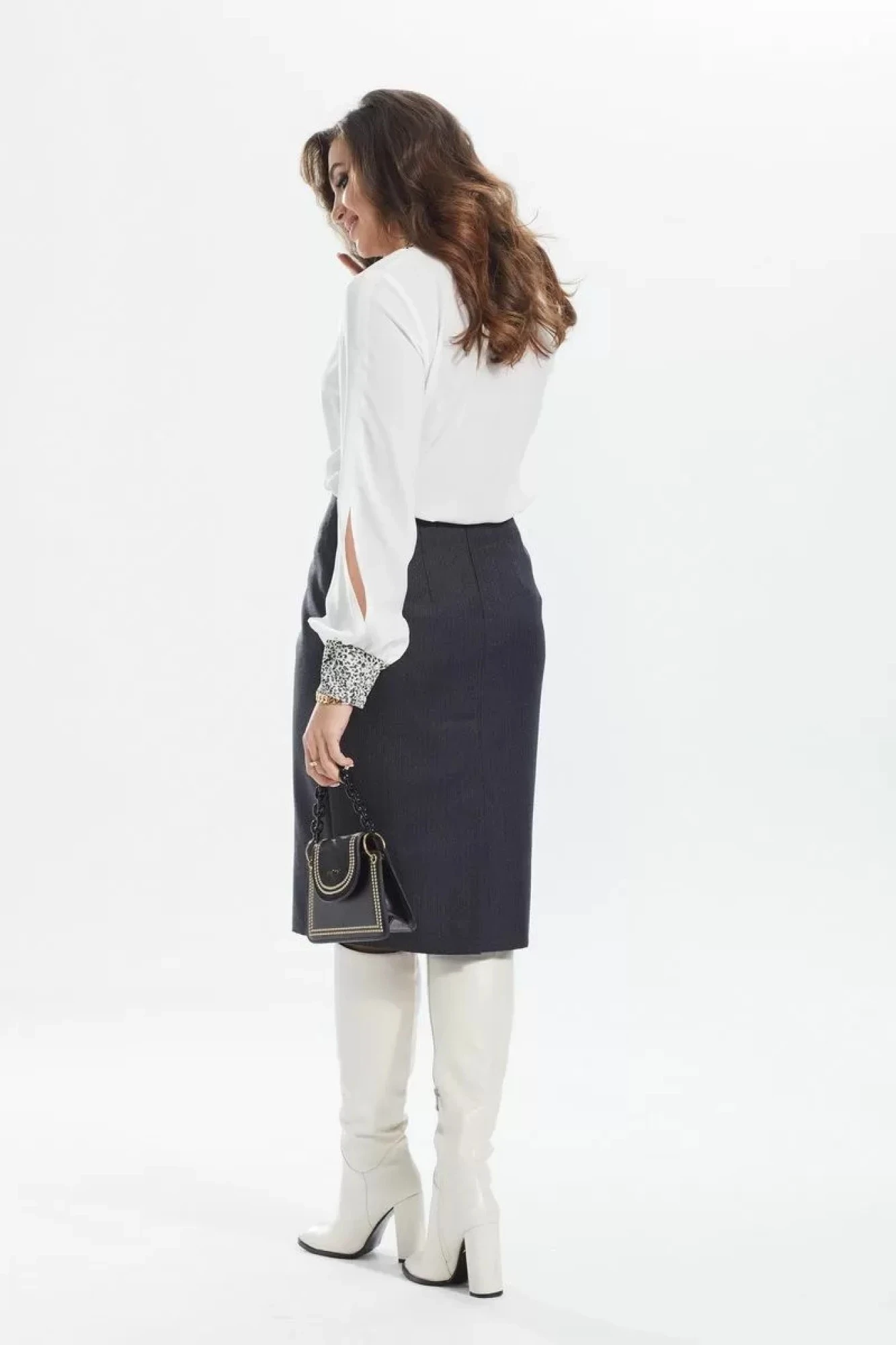 Блузка прямого силуэта с декоративной отделкой по горловине и переду. V-образная горловина. По полочке нагрудные вытачки. В боковых швах разрезы. Рукав втачной длинный, глубоким декоративным разрезом. Застегивается на манжет из отделочной ткани.