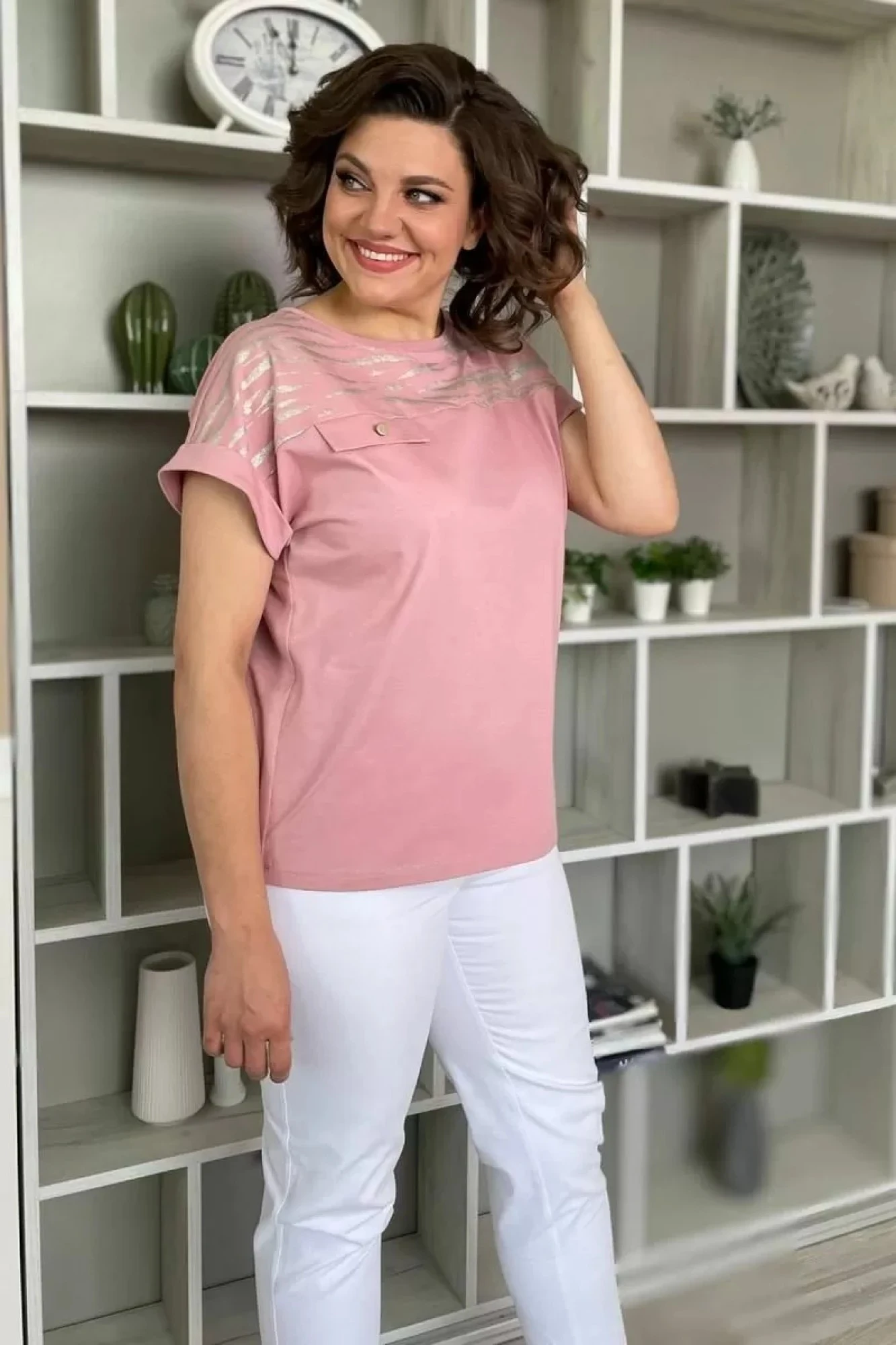Джемпер женский прямого силуэта. Перед джемпера оформлен притачной кокеткой с принтом. В шов притачивания вставлен клапан. Спинка со средним швом и кокеткой. Спущенное плечо. Вырез проймы оформлен манжетой. Вырез горловины лодочка.