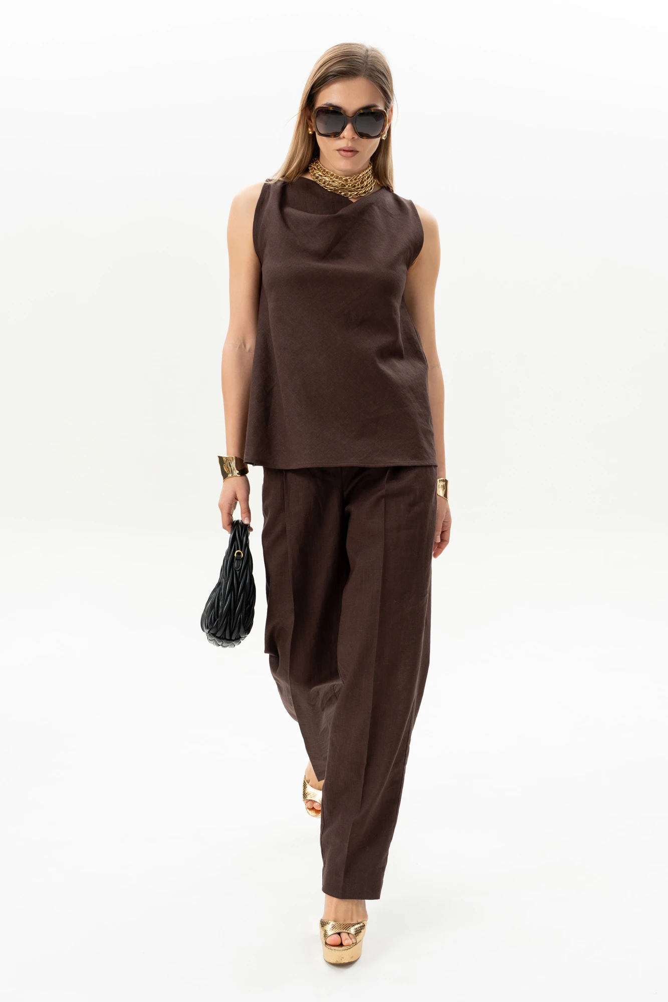 Блузка прямого кроя с асимметричной горловиной без рукавов. Длина блузки по центру спинки 59 см.