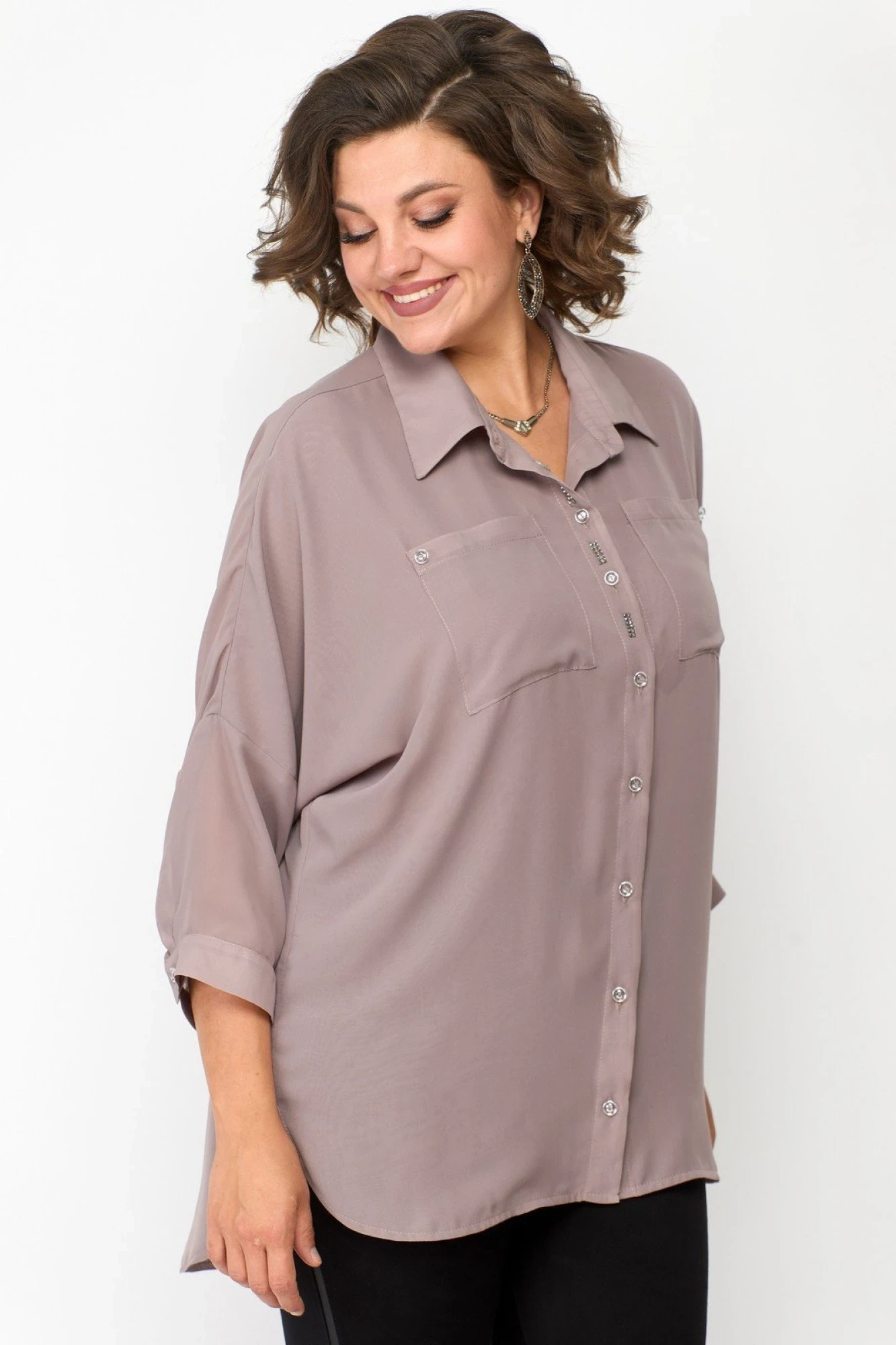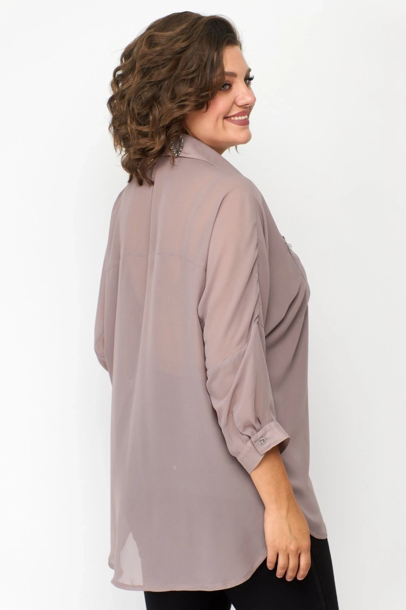 Блузка для женщин разной возрастной категории и разного телосложения. Блузка удлиненная, свободного кроя. Застежка-планка с прорезными петлями на пуговицах. Спинка свободного кроя без талиевых вытачек. По центру спинки кокетка. Воротник рубашечного типа. Низ изделия с фигурными вырезами по боковому шву. Украшением изделия служат стазы по планке. Линия плеча спущенная, рукав притачной, по низу рукава манжет с застежкой на пуговицу. Есть два накладных кармана.