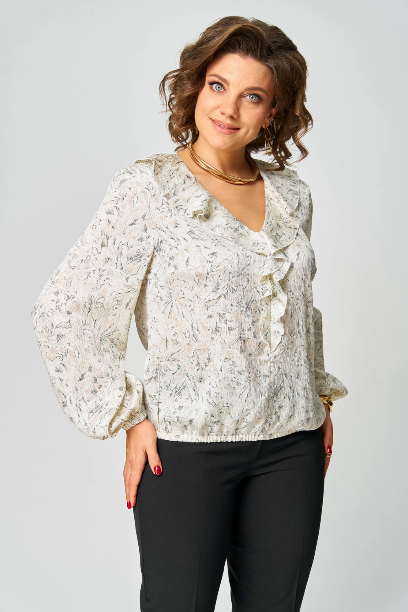 Блузка женская нарядная, прямого кроя, с втачным рукавом. Вырез горловины v- образной формы оформлен воланом, переходящим в шов по переду. По линии груди вытачки. Спинка цельная. Рукав длинный расширенный к низу. Низ блузки и рукава собраны на резинку.