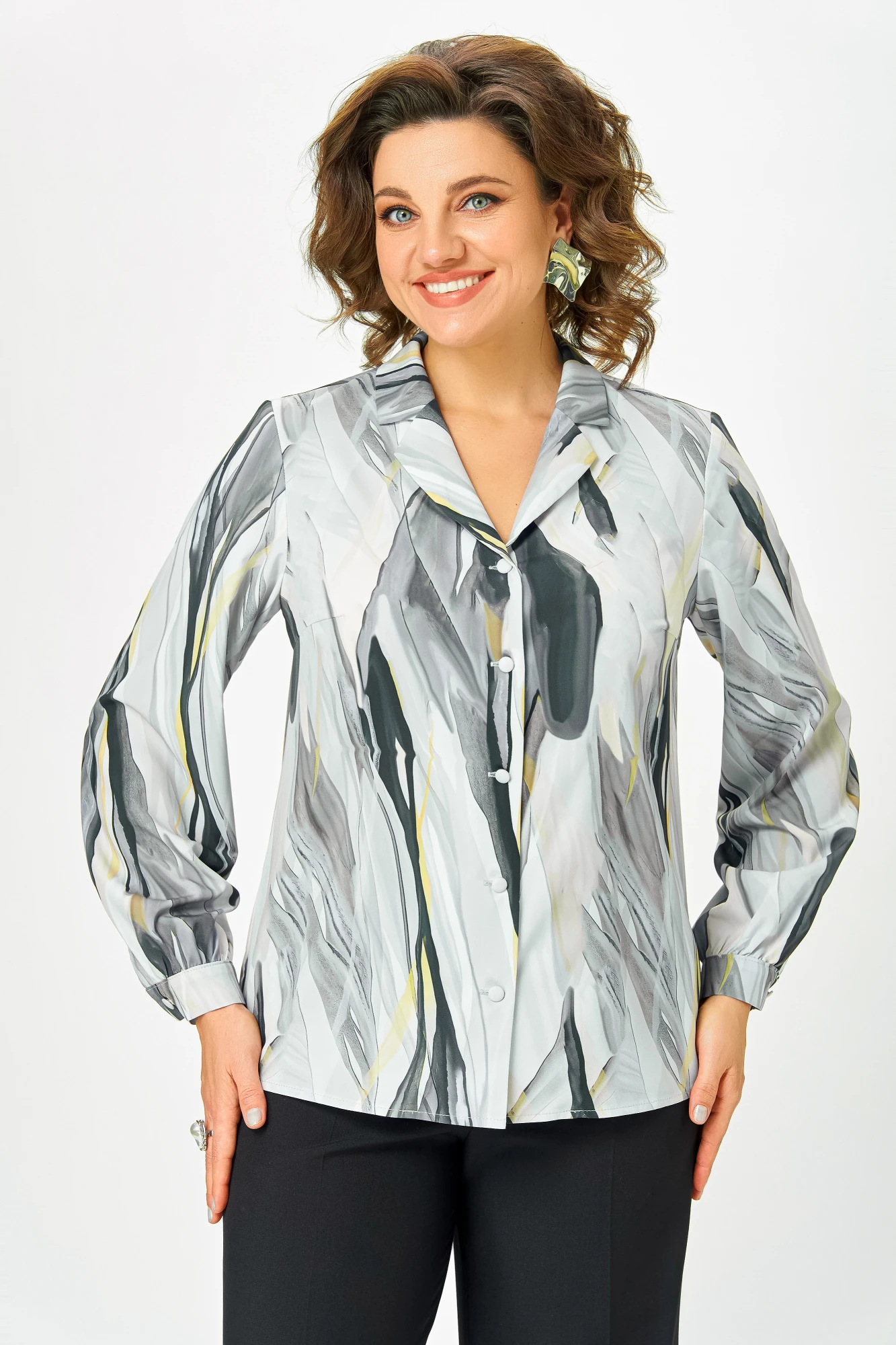 Блузка женская из мягкой вискозной ткани, прямого силуэта с центральной застёжкой на петли и декоративные пуговицы. По переду обработаны нагрудные вытачки, спинка цельная. Воротник пиджачного типа с отложными лацканами. Рукав втачной, одношовный длинный, внизу со сборкой и манжетой, которая застёгивается на петлю и пуговицу.
