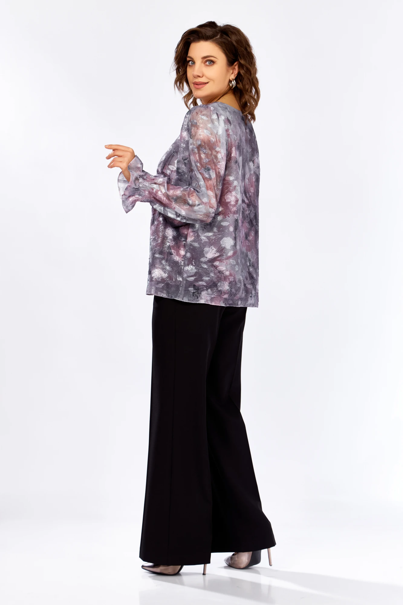 Блузка А-силуэта из нежной шифоновой ткани с лёгким эффектом «жатки», на подкладке из шифона. Полочка с нагрудными выточками, спинка без особенностей. Горловина круглая. Рукав втачной длинный по окату со сборкой, в нижней части собран на эластичную нить, которая внизу образует рюшу высотой 6 см.