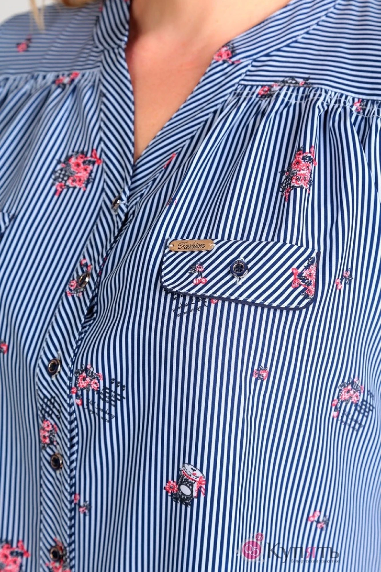 Блуза женская, свободного силуэта, чуть расширенная к низу. Застежка центральная, на планку длиной чуть ниже линии груди. Рукав длиной ¾, с патой из отделочной ткани. Стойка изделия скругленной формы, поэтому прилегает к фигуре по горловине. На спинке и полочке имеются кокетки, под которыми сборка дополнительно закреплена двумя отделочными строчками. Нагрудные клапаны отделаны переокантовкой за счет нижних клапанов из отделочной ткани. Так же из отделочной ткани выполнены нижняя стойка и нижние планки.
