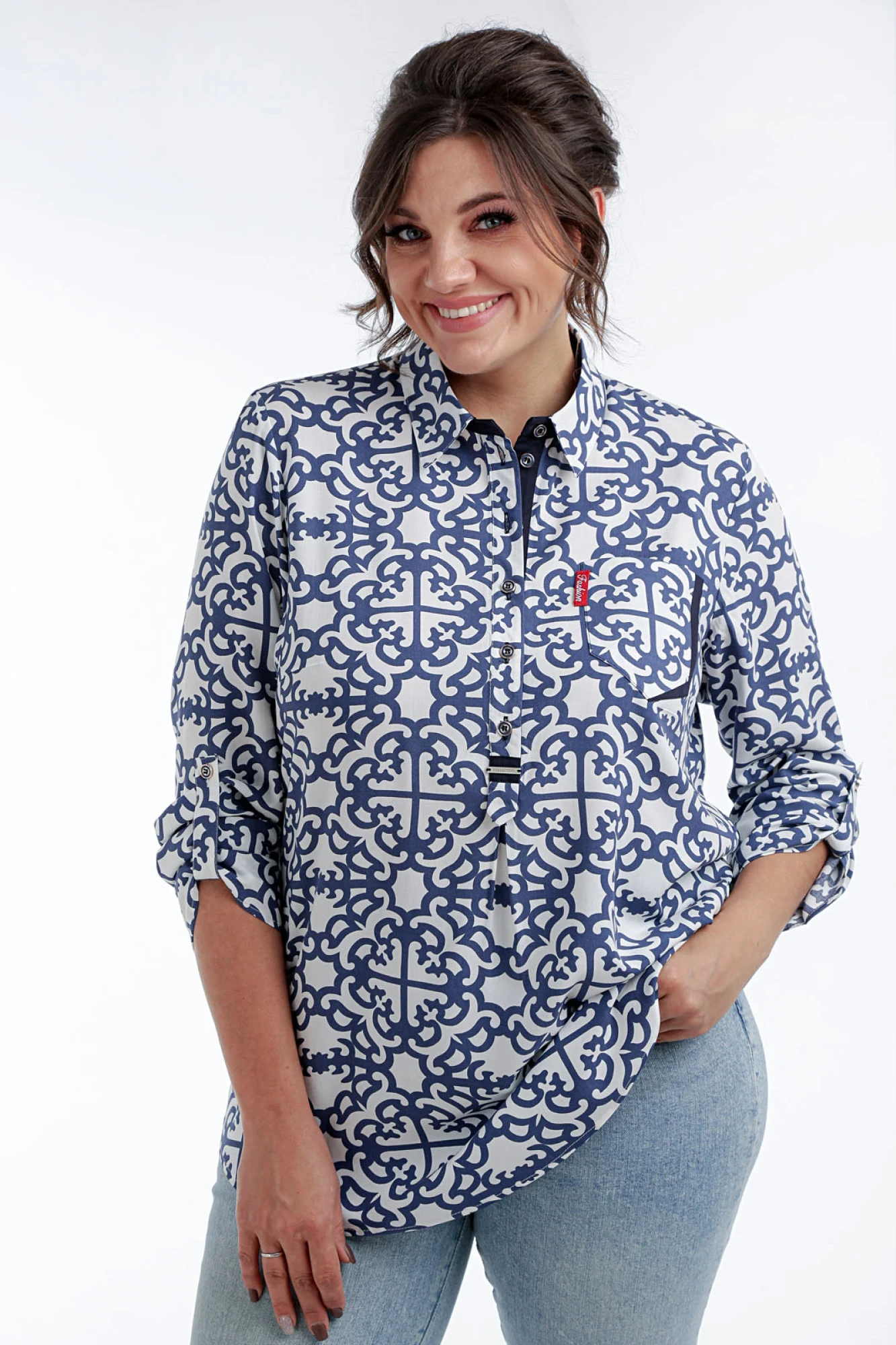 блуза свободного силуэта, с центральной застежкой на планку по полочке. Воротник втачной, на стойке, рубашечный. На полочке имеются нагрудные вытачки. На левой полочке настрочен нагрудный карман. Рукав втачной, одношовный, длинной 57 см