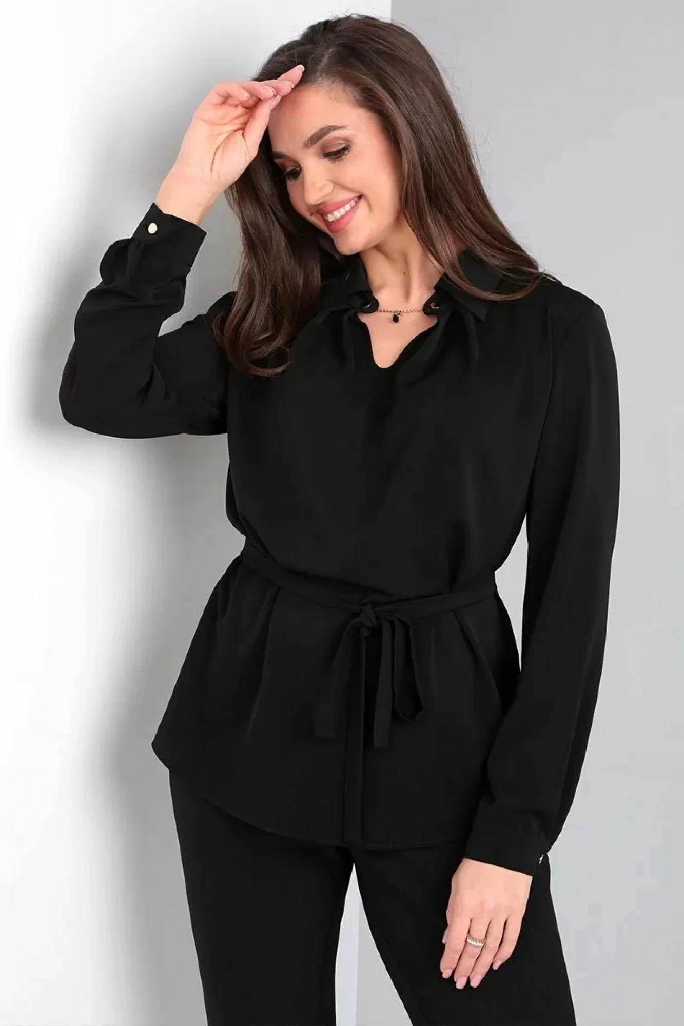 Блуза, свободного силуэта, может приталиваться поясом из этой же ткани. Воротник рубашечный, на стойке. Застежка центральная, застегивается съемным украшением. Рукав втачной с манжетом.