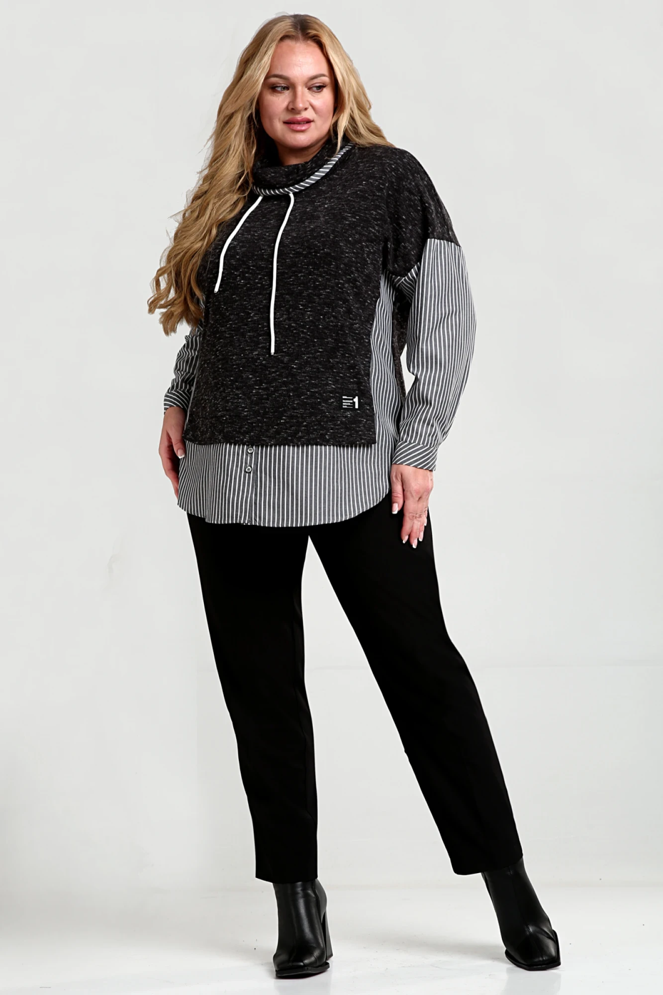 Эта спортивная блуза свободного силуэта с спущенной линией плеча отлично подходит для создания как классического, так и спортивного стиля. Изделие выполнено из сочетания трикотажного полотна и рубашечной хлопковой ткани, что обеспечивает комфорт и стиль. Горловина углубленная, а воротник-хомут стягивается, добавляя оригинальности и функциональности. Рукава выполнены в рубашечном стиле с одношовным кроем и притачным манжетом, что придаёт блузе элегантный вид. Полочка блузы по центру и по бокам соединяется с вставкой из хлопка, создавая эффект выглядывающей рубашки. Эта деталь добавляет интересный акцент и делает модель универсальной для различных образов.