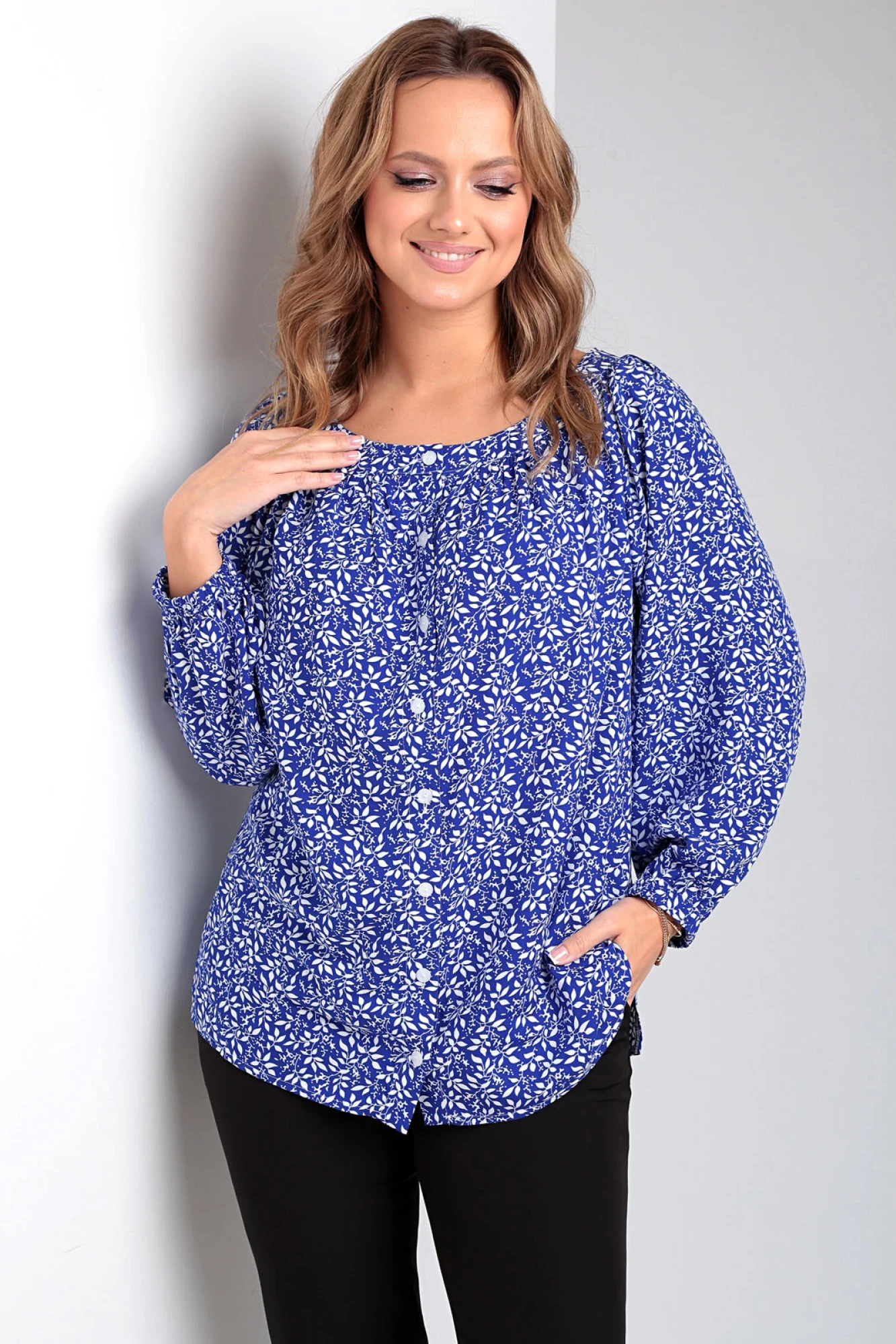 Блуза свободного силуэта. Застежка центральная, на фигурную планку. Горловина круглая, на обтачке. Рукав длиной 59 см «реглан», в верхней части оката присборен, что позволяет скрыть полноту рук, особенно в верхней части. Низ рукава присборен на резинку.