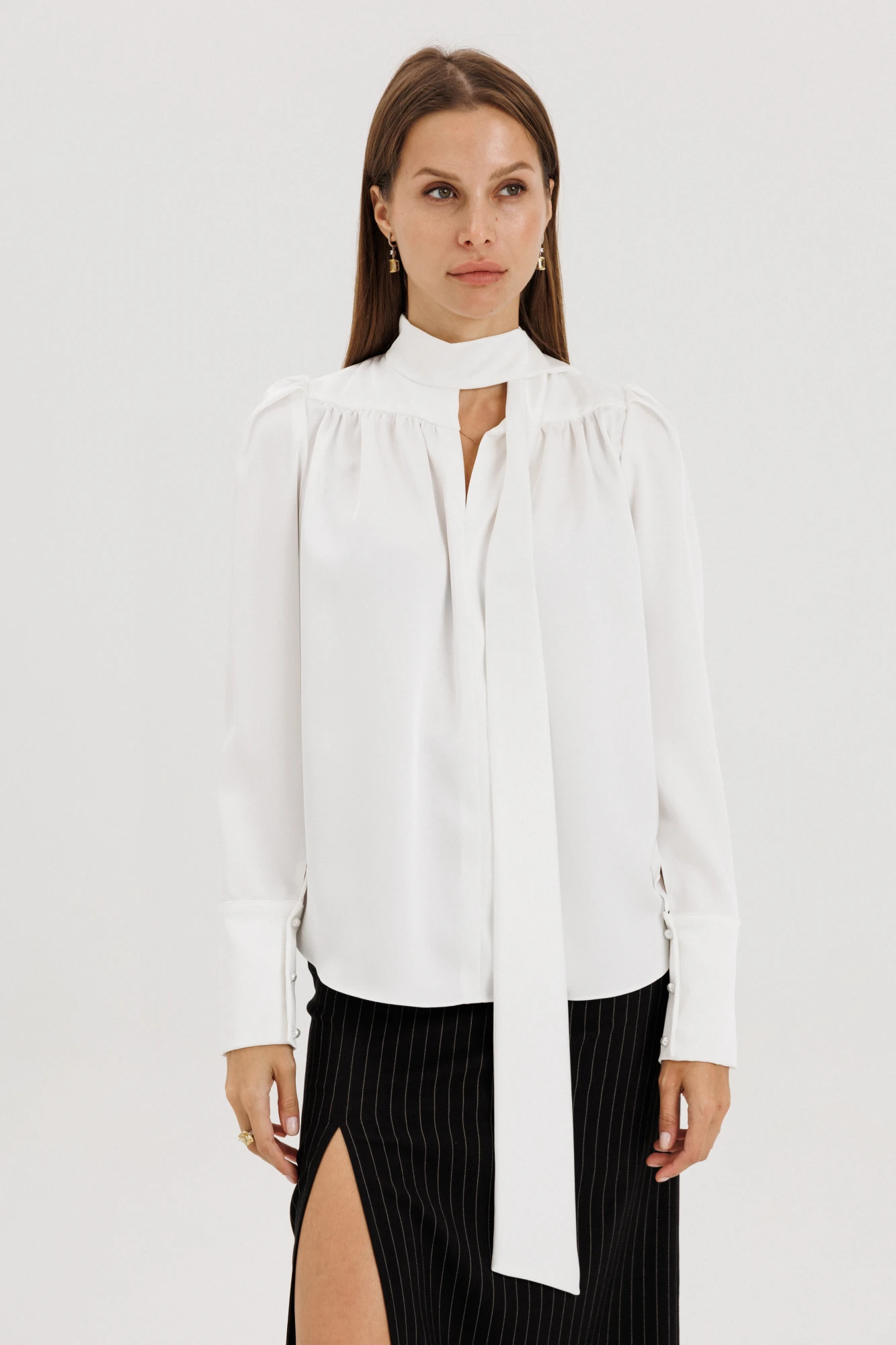 Блуза из атласа - тренд, котрый не выходит из моды. Блузу можно носить с джинсами, брюками, юбками. Блуза свободного кроя, горловина с воротником-стойкой, переходящей в бант, рукав притачной, манжета широкая, застежка на петли-пуговицы, по линии спины отрезная кокетка со сборкой. Низ блузки асимметричный. Рукав 66 см, по переду длина 63 см, по спинкеи длина 66 см .Рост модели на фото 178 см.