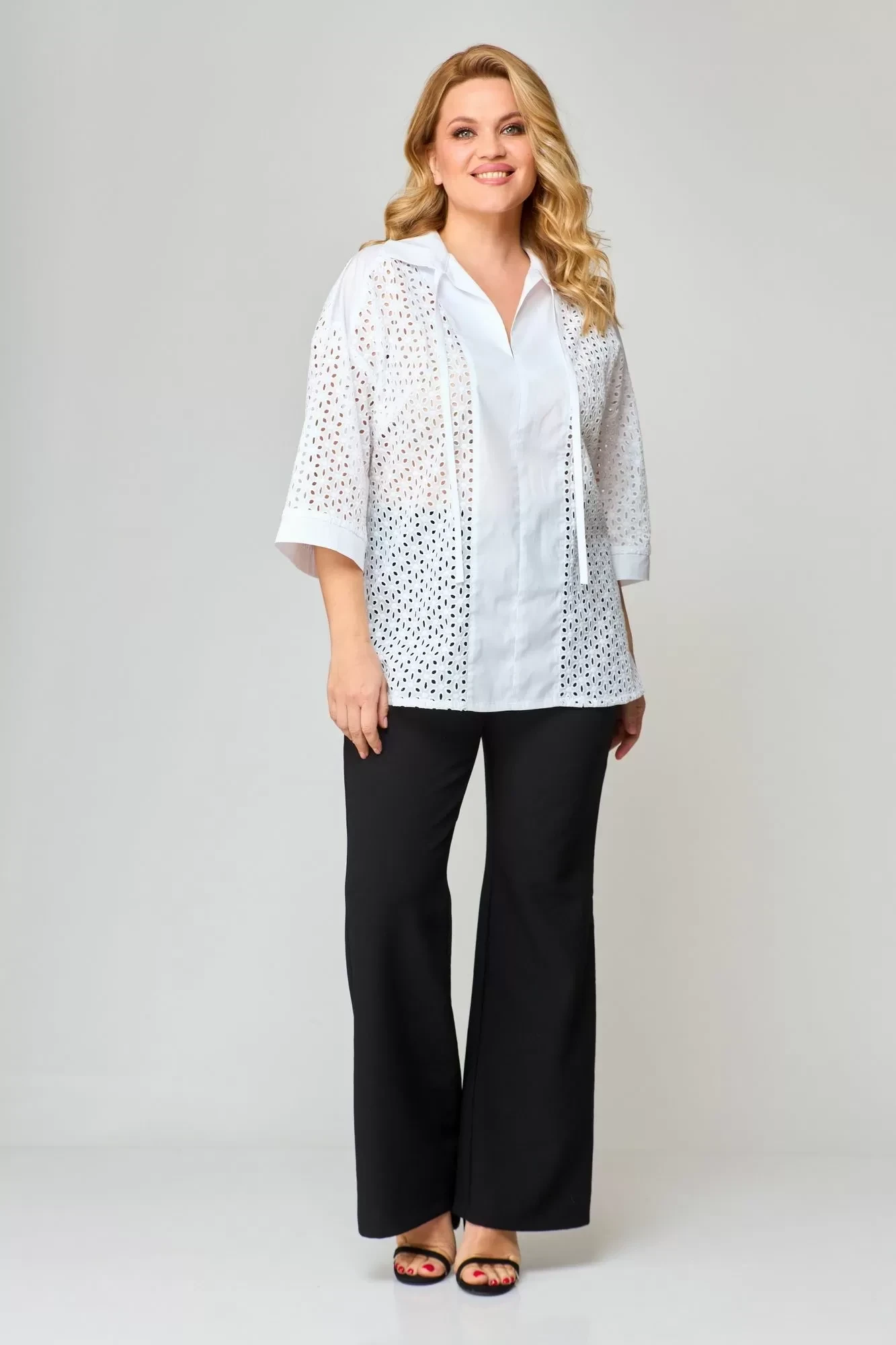 Блузка прямого силуэта, выполнена из ткани “решелье”, в качестве отделки использована гладкая ткань. Полочка блузки с нагрудными вытачками, отрезной плечевой кокеткой и центральной вертикальной вставкой из гладкой ткани. В верхней части среднего шва полочки обработан разрез. Горловина обработана притачным воротником рубашечного типа, на стойке, с завязками. Пройма углубленной формы со спущенной линией плеча. Рукав рубашечного типа, длиной 3\4, одношовный, по низу на притачной манжете из гладкой ткани.Прямой силуэт, свободный крой (не оверсайз и не облегающий) — такой рубашке всегда найдётся применение. ВАЖНО : стирка при 30 градусах!