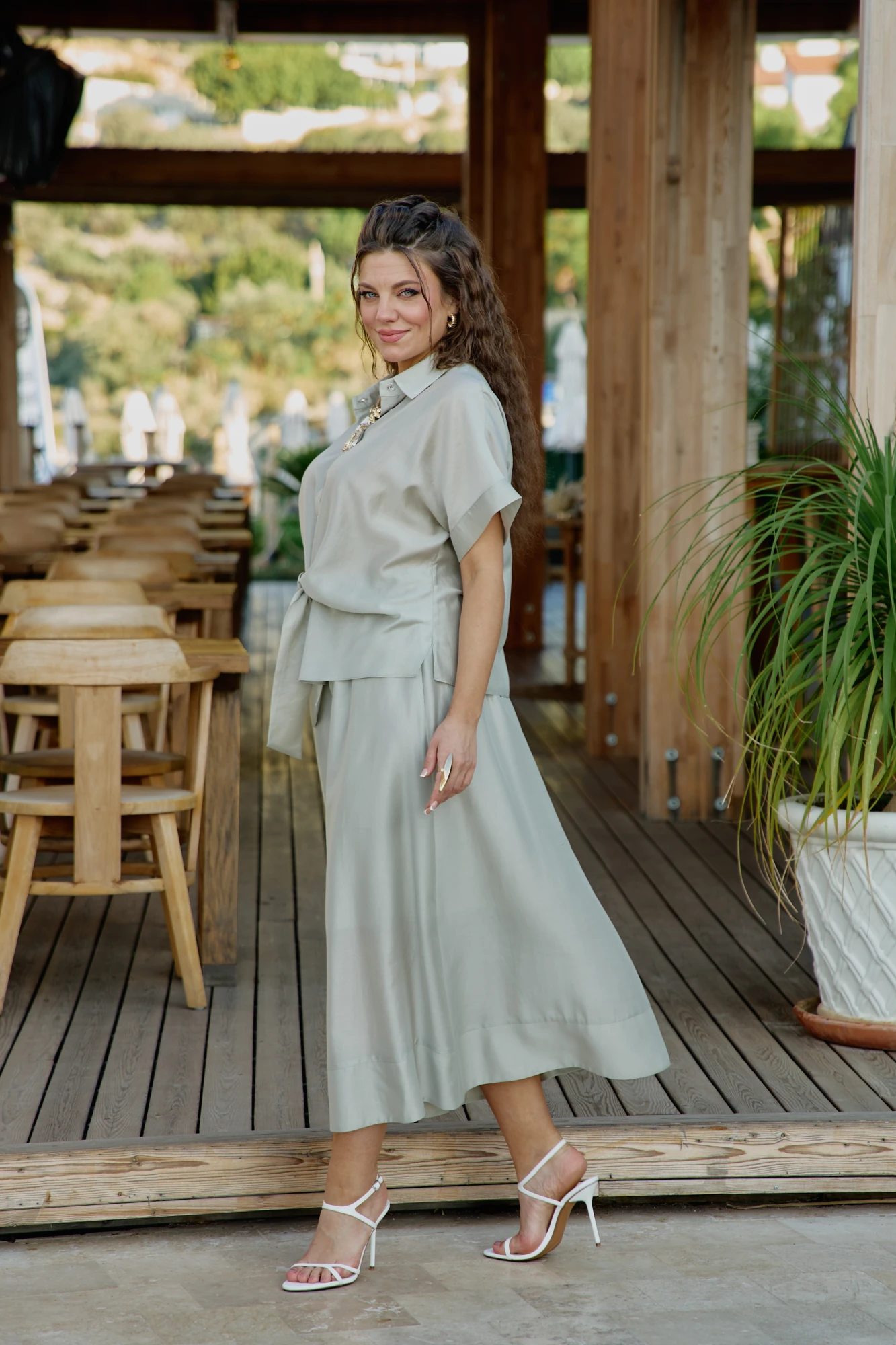 Это не просто одежда — это тонкая игра света и тени, где полупрозрачность становится не недостатком, а главной художественной задумкой. Блузка с центральной застёжкой на декоративные петли-пуговицы по планке, с воротником рубашечного типа. Её свободный крой обволакивает фигуру, не стесняя, а подчёркивая её естественные линии. Рукав в блузке цельнокроеный с притачной манжетой по низу. По переду блузки цельнокроеные отрезные детали завязывающиеся на бант. Спинка с отрезной кокеткой. В боковых швах блузки разрезы. Полупрозрачная шоколадная блузка — универсальный элемент, который работает в любом стиле. Ключ к успешному образу — баланс: если блузка воздушная и чувственная, низ должен быть более структурированным, и наоборот. Экспериментируйте с текстурами, не бойтесь контрастов и помните — эта вещь создана быть центром внимания в любом ансамбле. Длина блузы 56 см (р 50-54), 57,5 см (р 56-60), длина рукава 32 см (р 50-54), 33 см (р 56-60).