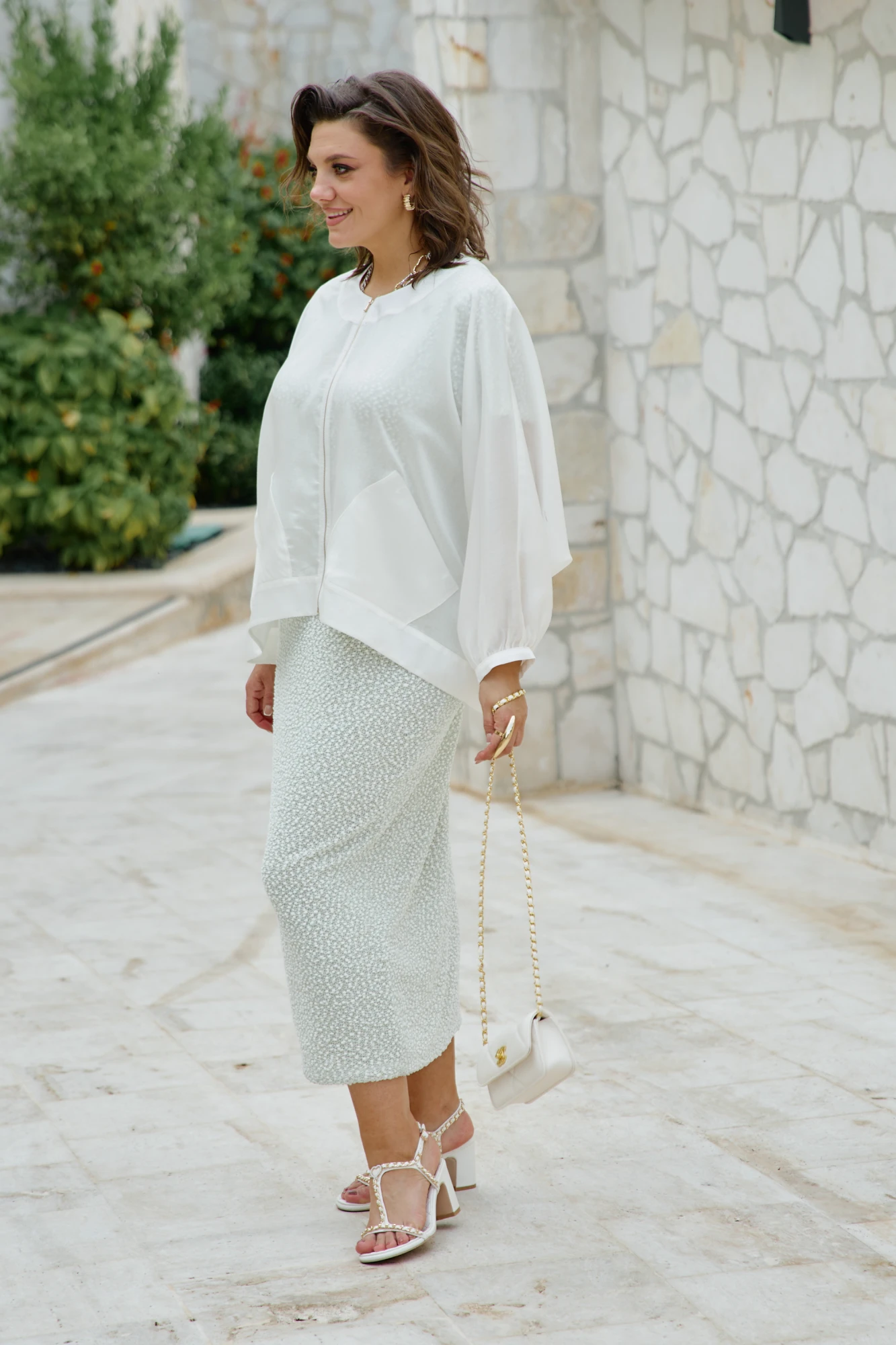 Блузон легкий полупрозрачный в романтическом стиле. В верхней части большого объема, плечевой пояс с естественным наклоном и плавным переходом в линию рукава. Блузон выполнен из полупрозрачной вуали в один слой. Рукава цельнокроенные, немного укороченные с сборкой по низу и притачной узкой манжетой. Застежка вертикальная по переду на металлическую тесьму-молнию. По переду выполнены накладные карманы из вуали. По спинке блузон немного удлинён. Блузон в тренде сезона и будет актуален в следующих. Это стильная женская одежда, которая идеально сядет на любую фигуру. Его легко сочетать с платьем, брюками, комбинезоном. Он станет любым предметом вашего гардероба в теплое время года, образ в нем женственный и элегантный. Фасон современный, из качественных материалов. Блузон уместно надеть на торжество, прогулку с подругами, ресторан, кафе. Вы будете чувствовать себя в нем роскошно и на каблуках, и в спортивном стиле с кроссовками. Это универсальная нарядная одежда для женщины, которая себя любит. Длина блузона 68,5 см, длина рукава 68 см (р 52-56), 69 см (р 58-62).