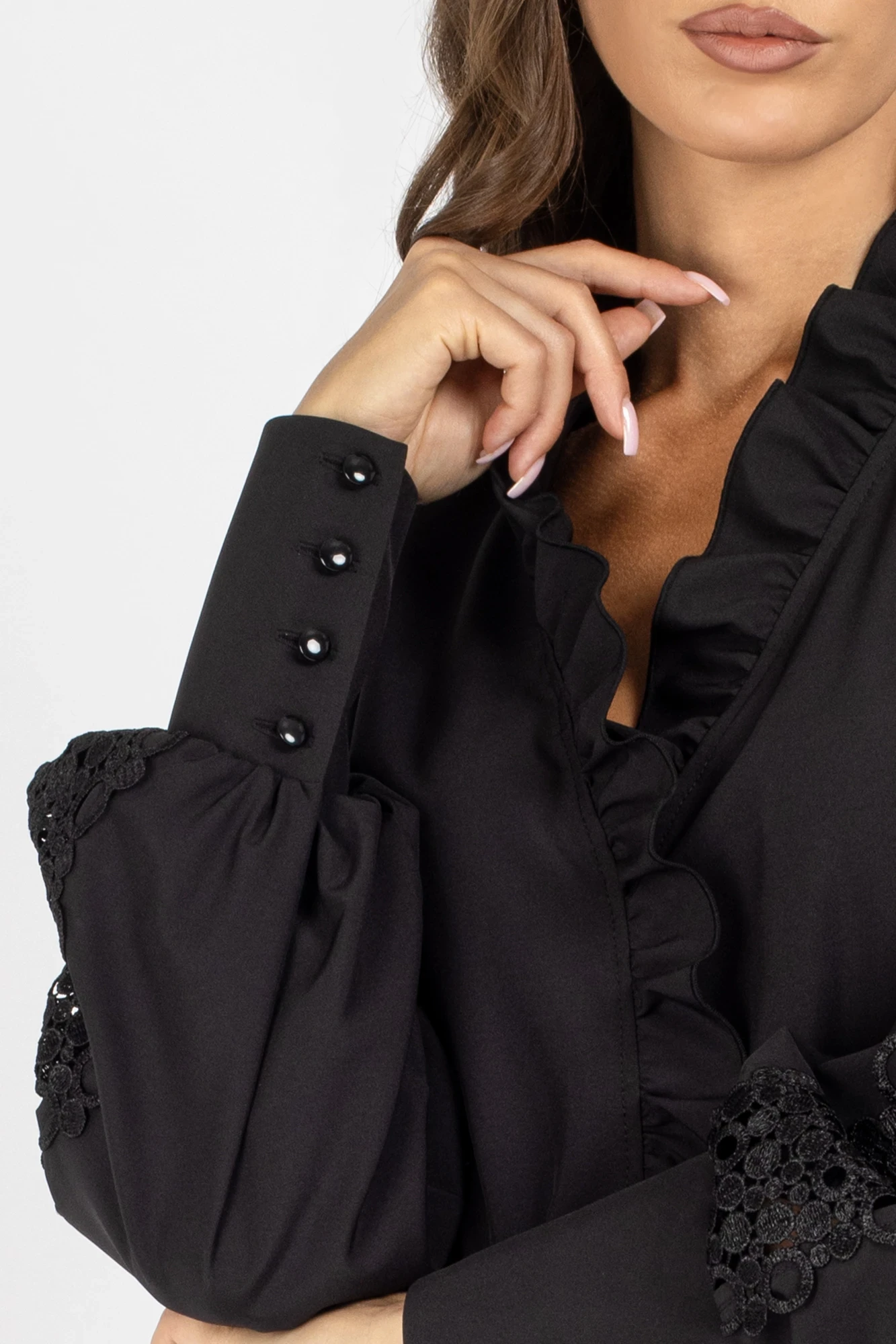Рукав втачной из двух частей, по центру с настроченным кружевом, с притачной манжетой и застегивающейся на 4 пуговицы.