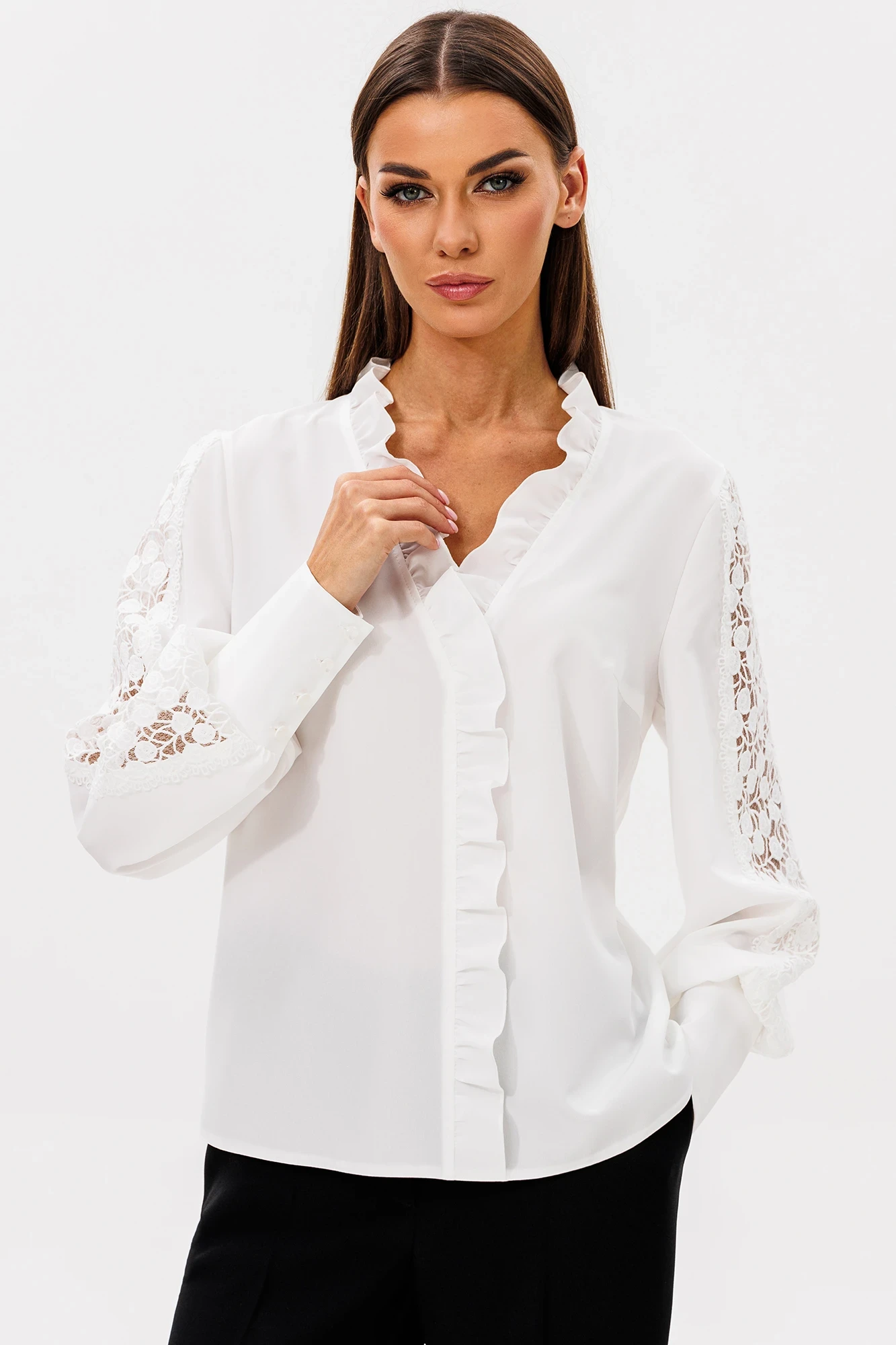 Рукав втачной из двух частей, по центру с настроченным кружевом, с притачной манжетой и застегивающейся на 4 пуговицы.