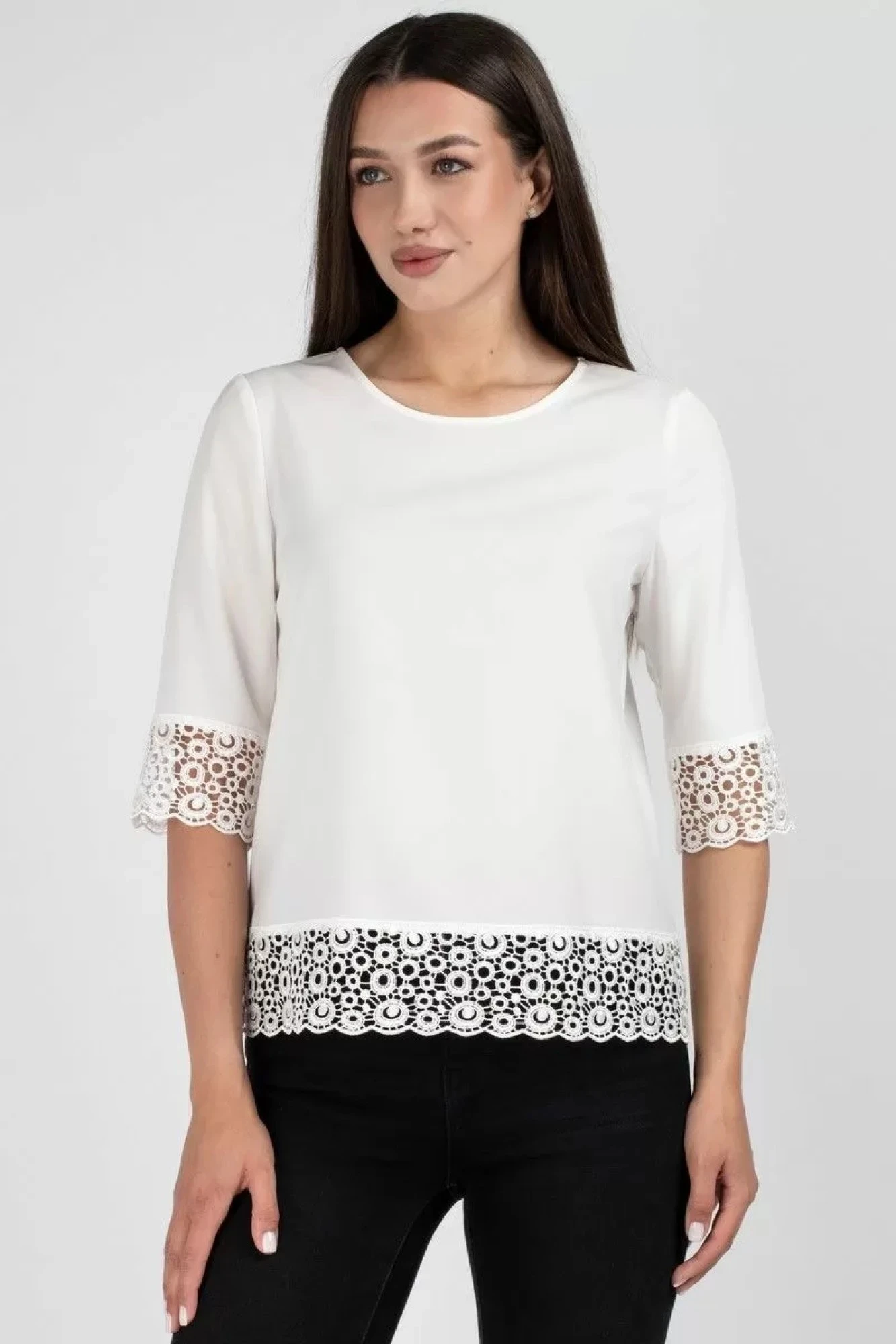 По низу переда спинки и рукава, настрочено отделочное кружево.