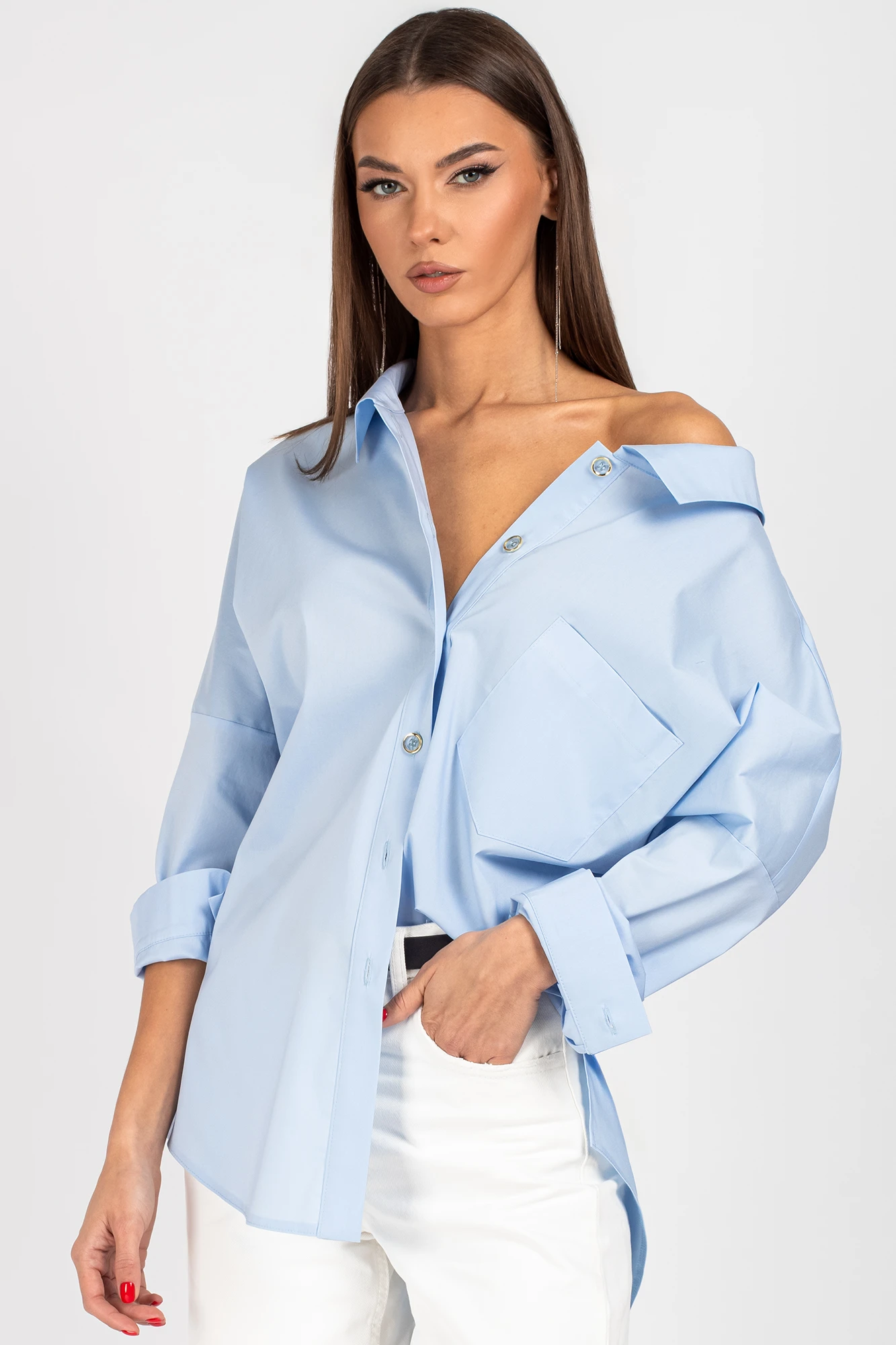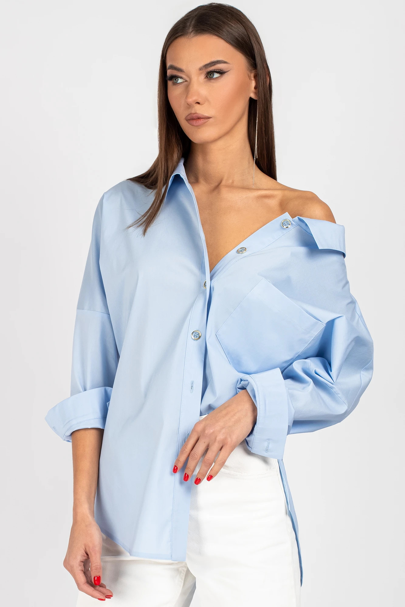 "Блузка-рубашка прямого силуэта со спущенным плечом.