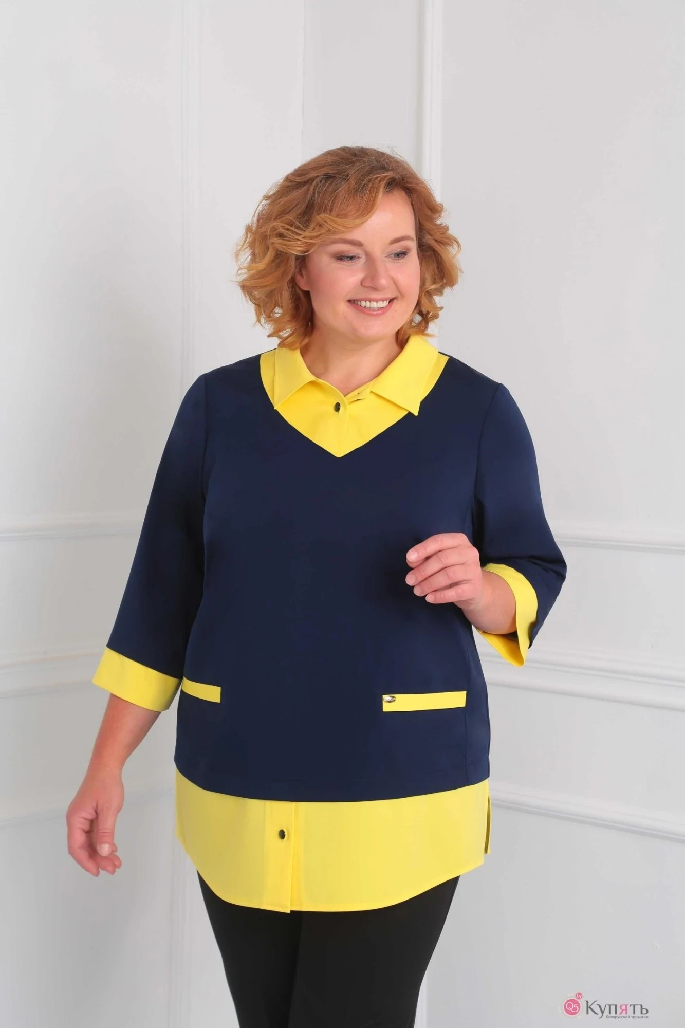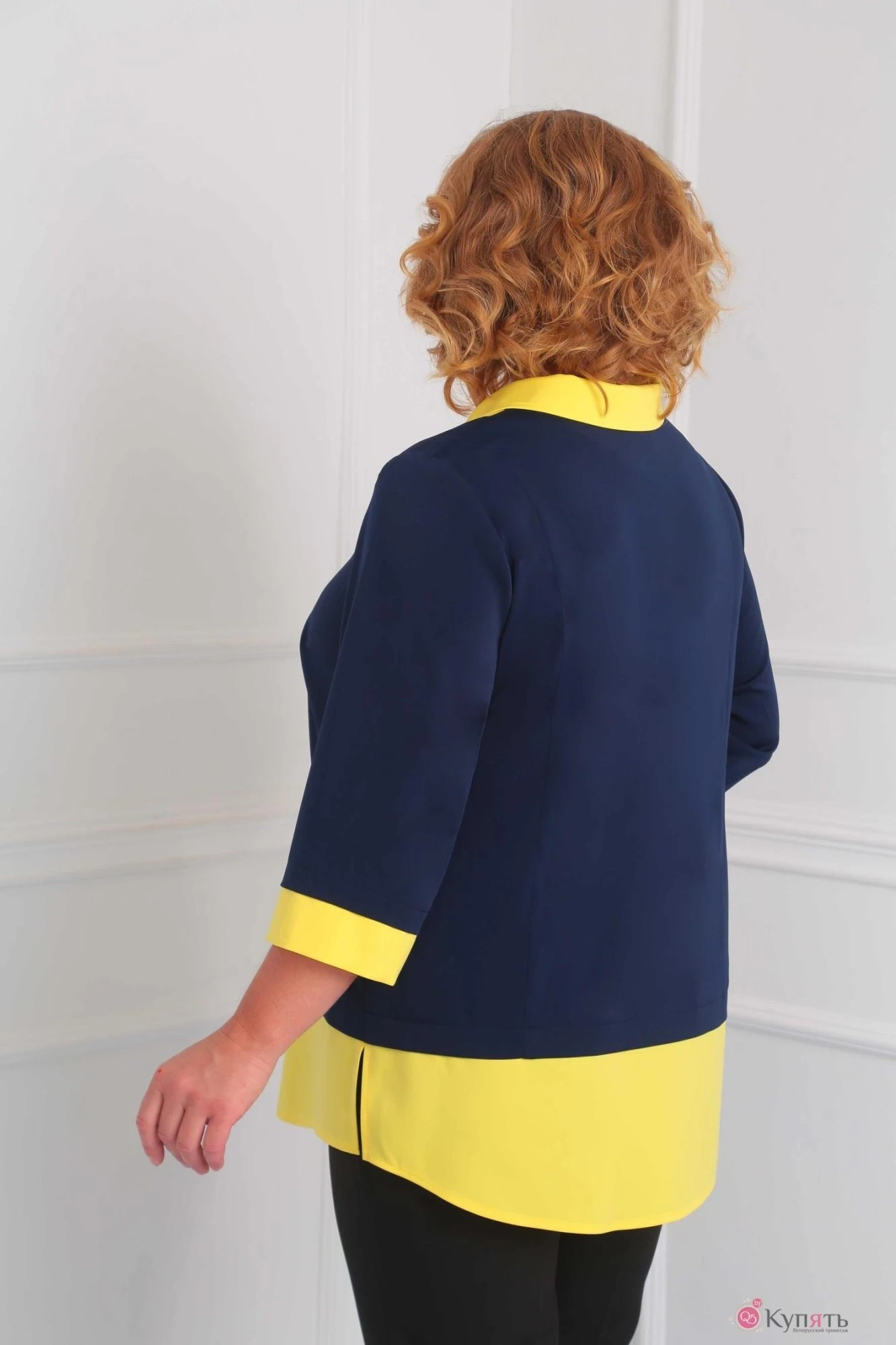 Блуза-имитация, выполнена из темно-синего трикотажа и желтой поливискозы.