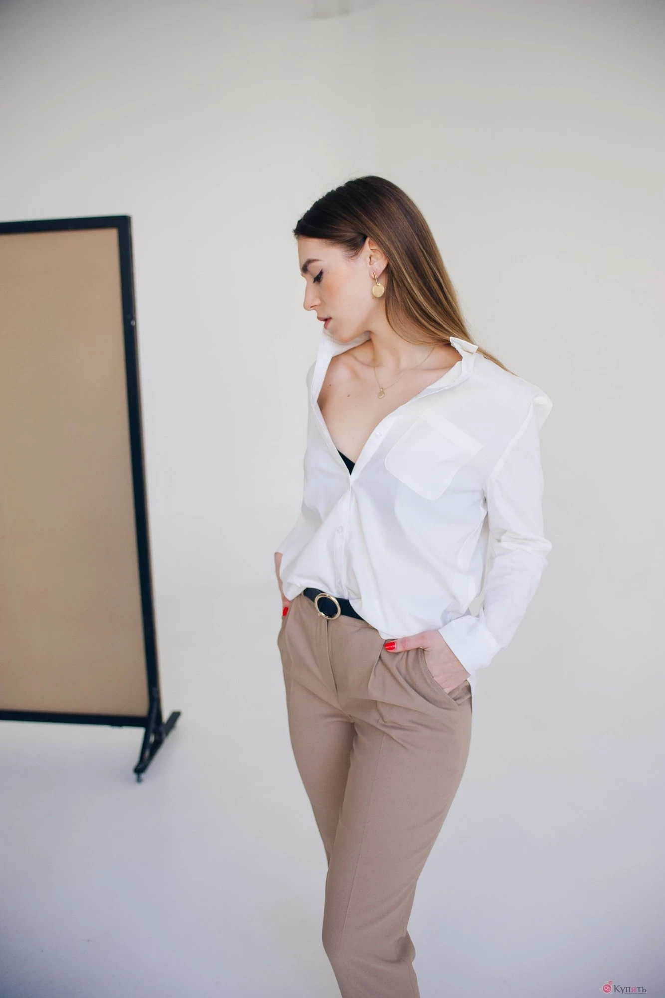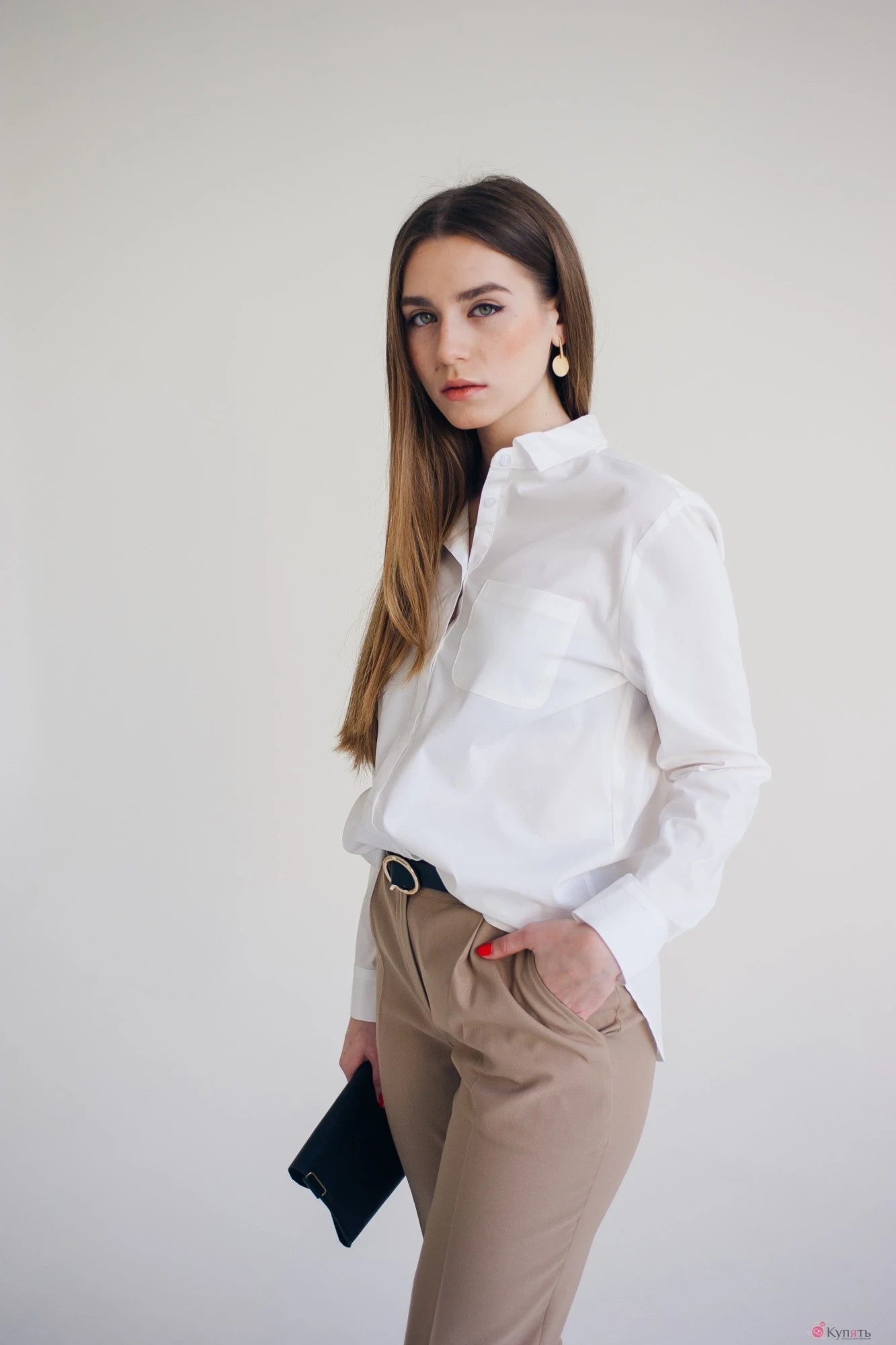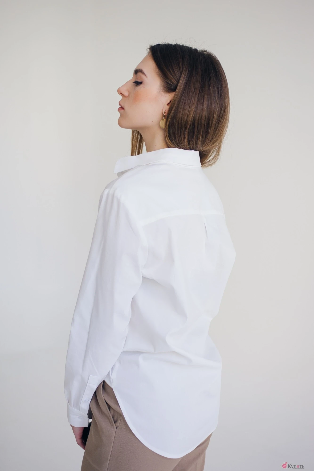 Рубашка свободного кроя с закруглённым низом. Спинка длиннее переда.
