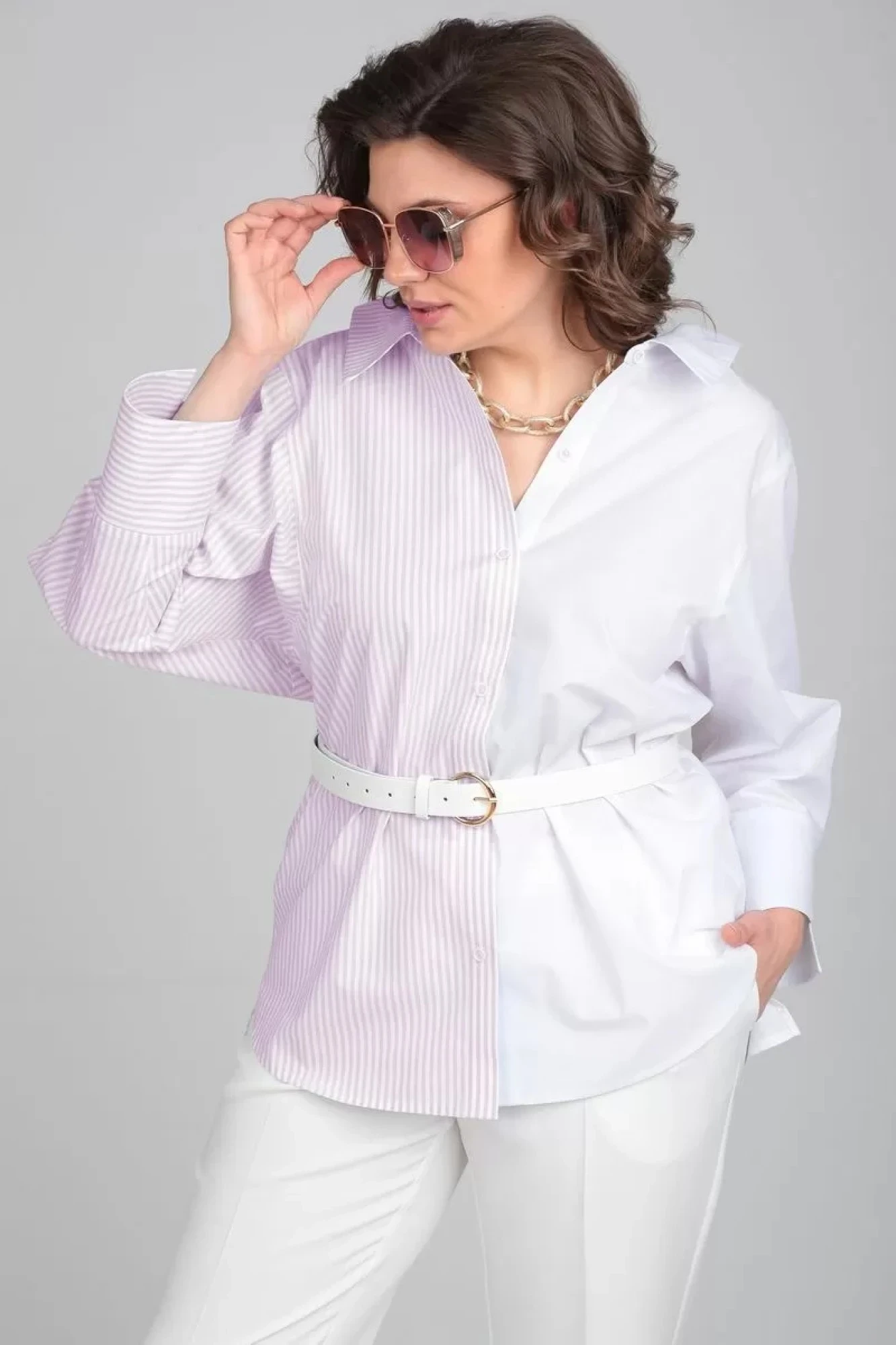"Рубашка женская со стояче-отложным воротником и застежкой спереди и сзади на петли и пуговицы на планках , рукава рубашечного типа на квадратных проймах. Рубашка выполнена из высококачественного смесового хлопка 2-х цветов.