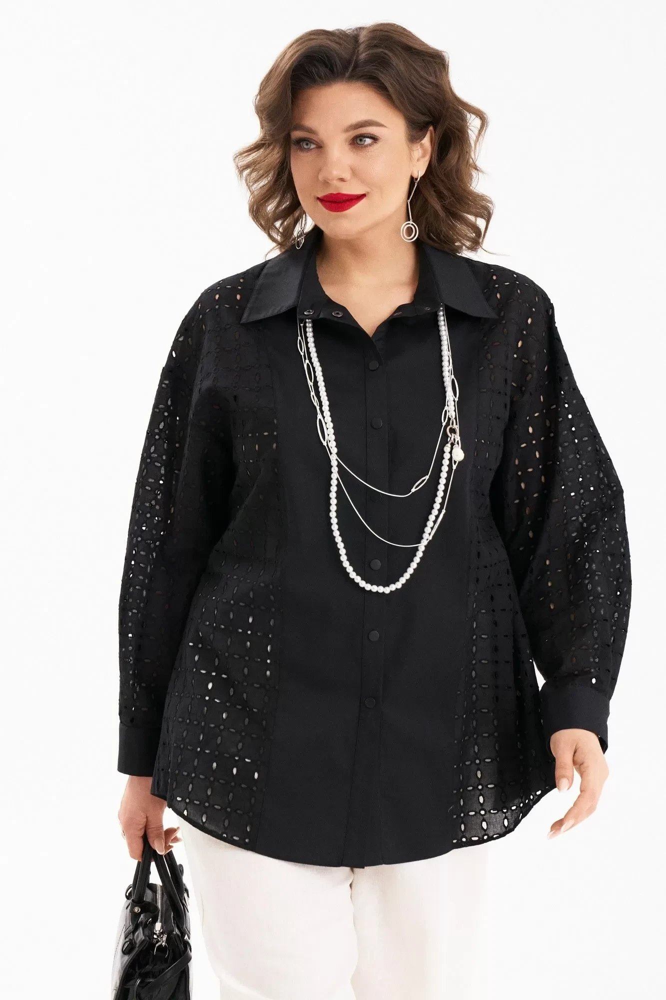 Удлиненная, стильная женская рубашка, свободного кроя, со спущенной линией плечаи фигурным низом. Рукава и бочки полочки выполнены из хлопкового шитья. По переду центральная застежка - планка на петли и пуговицы. Воротник рубашечного кроя на отрезной стойке. Рукав длинный с притачной манжетойпо низу, на застежке. По спинке двойная кокеткаи встречная складка. Рубашка удачно сочетается с брюками, шортами, юбкой.