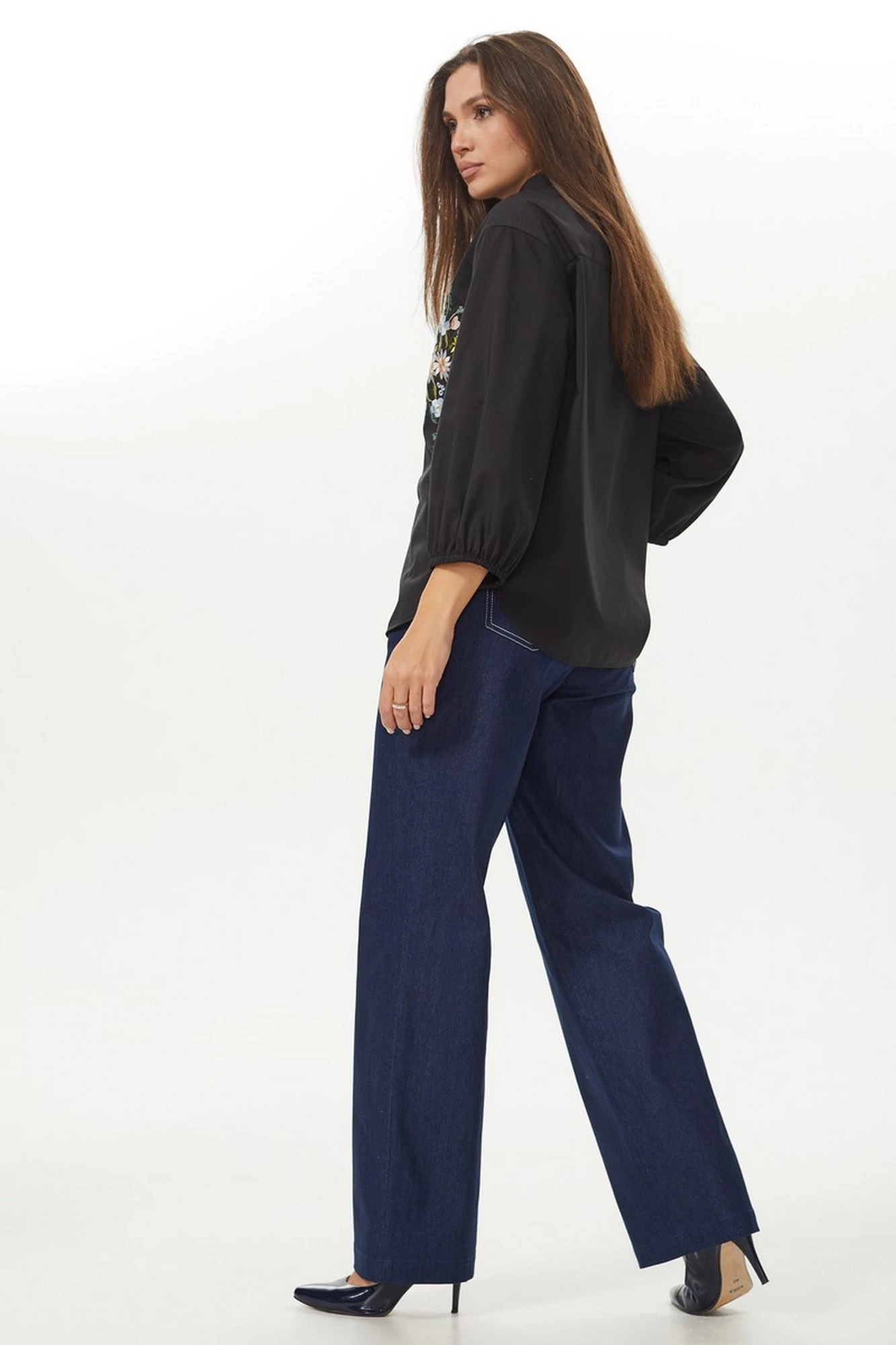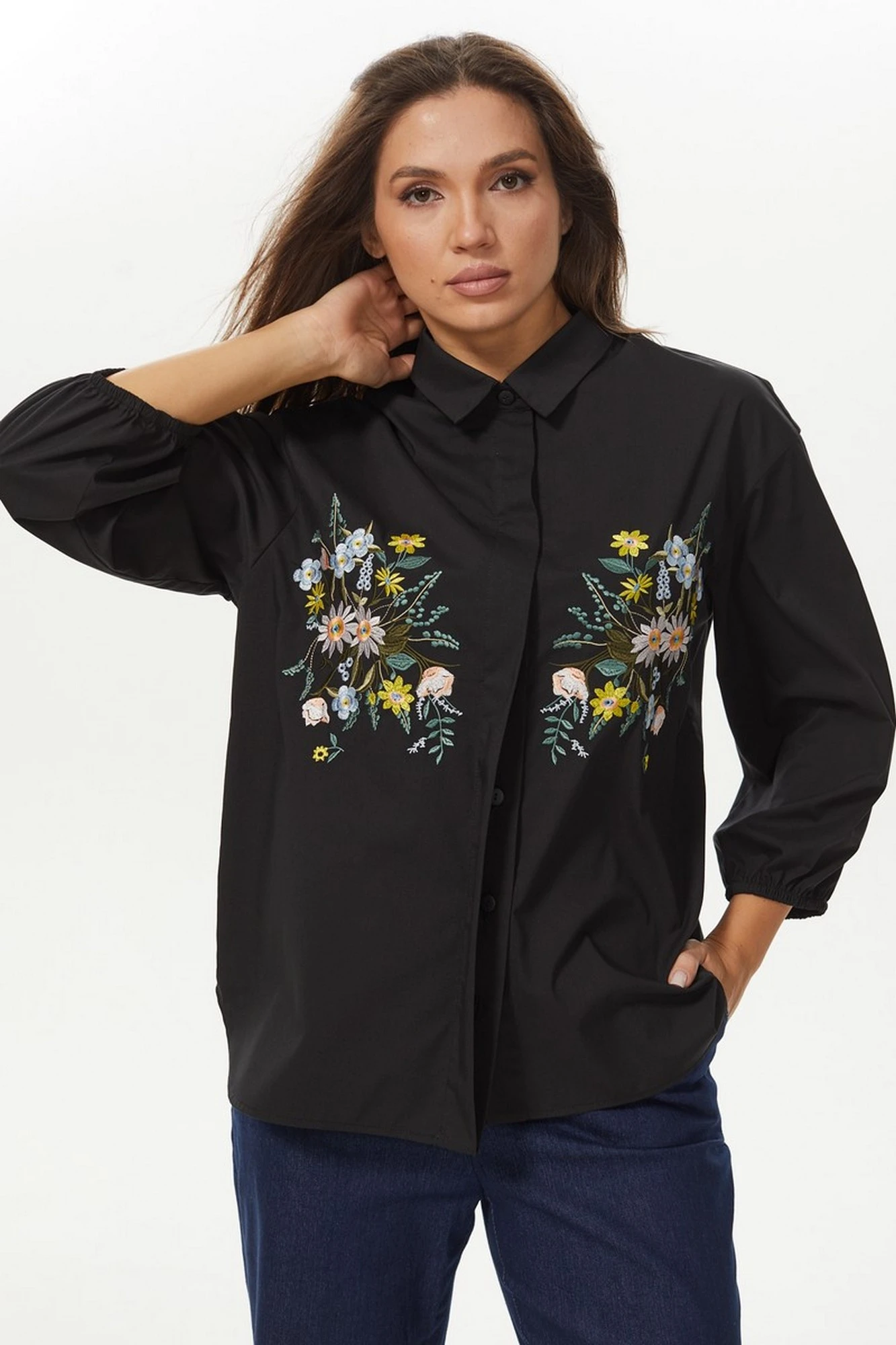 Воротник отложной на стойке. Застежка центральная потайная на петли и пуговицы, спинка с кокеткой. На полочке расположены две симметричные дизайнерские вышивки. Рукав 3/4 со спущеной линией плеча, одношовный, снизу собран на резинку.