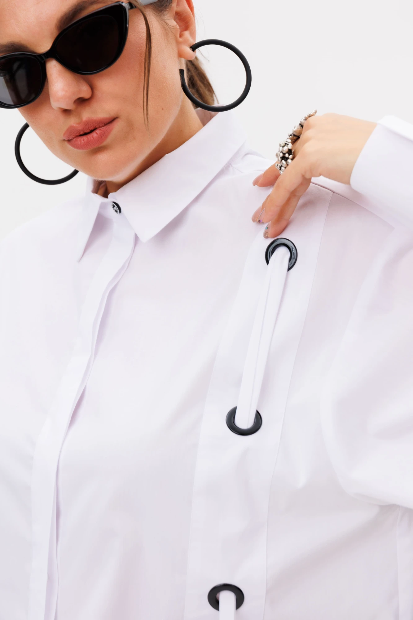 Элегантность модели подчеркивает отложной воротник на стойке и потайная застежка. Длинные рукава с классическими манжетами на пуговицах завершают лаконичный вид. Необычный характер рубашке придает декоративная планка с люверсами, добавляющая смелый акцент.