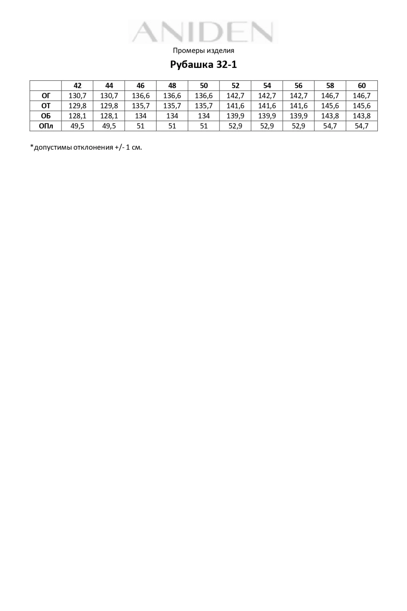 Таблица размеров