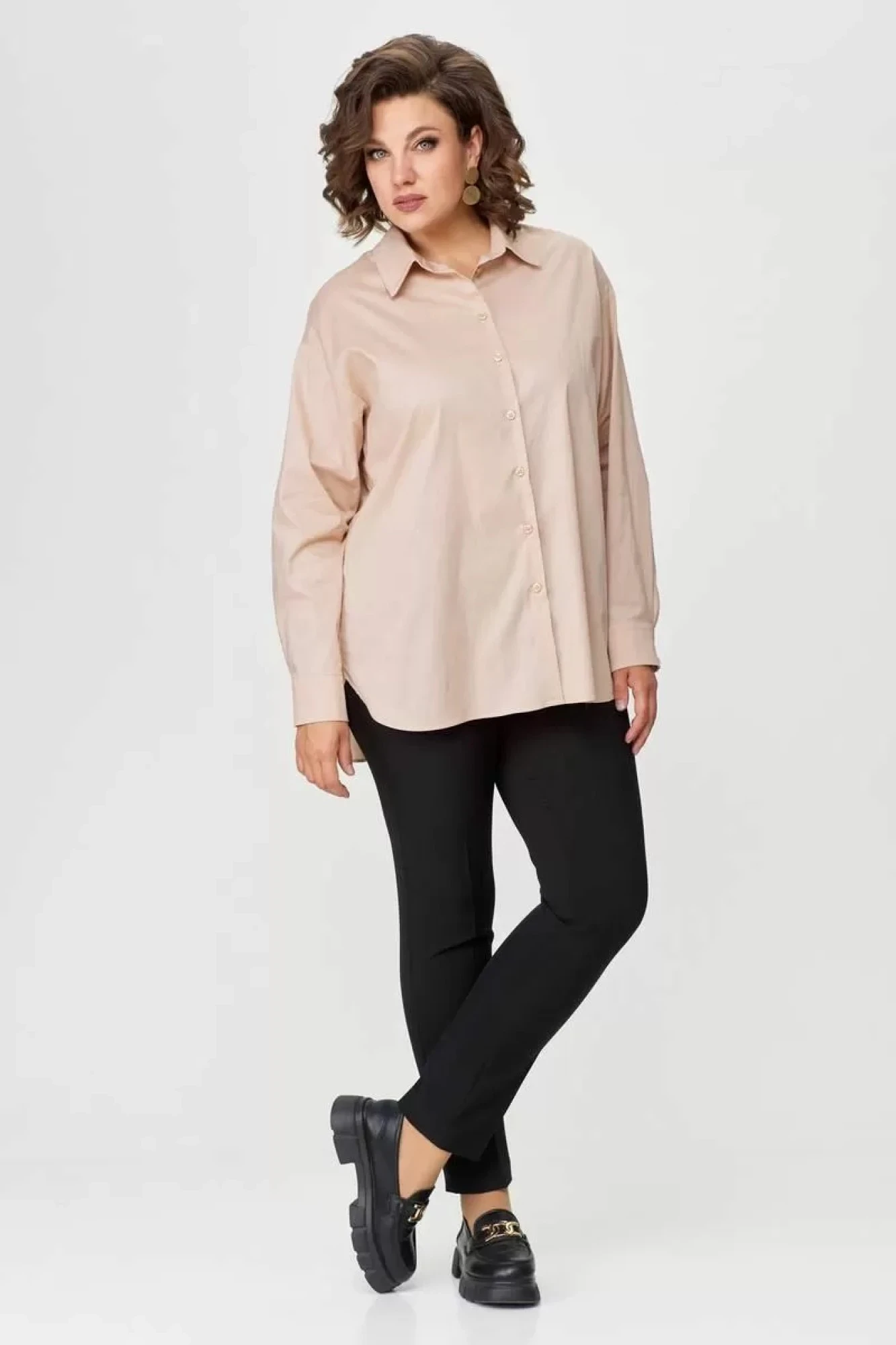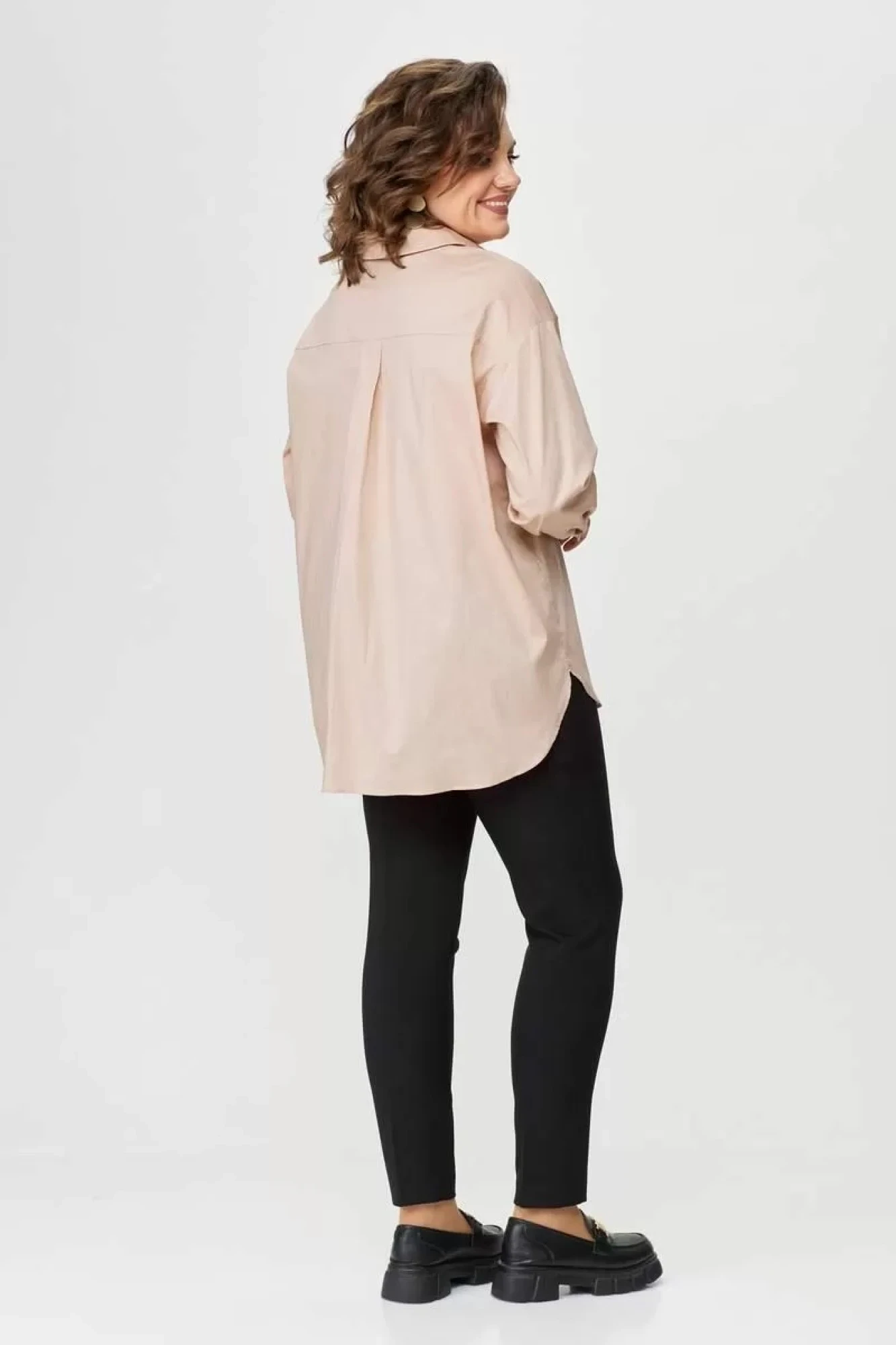 Рубашка свободного силуэта. Рукав рубашечный с разрезом и складками,заканчивается манжетой, которая застегивается на 2 петли и пуговицы.Плечо спущенное. На спинке двойная кокетка, от кокетки по центру спинки идет встречная складка. Ткань поплин, тянется по ширине.