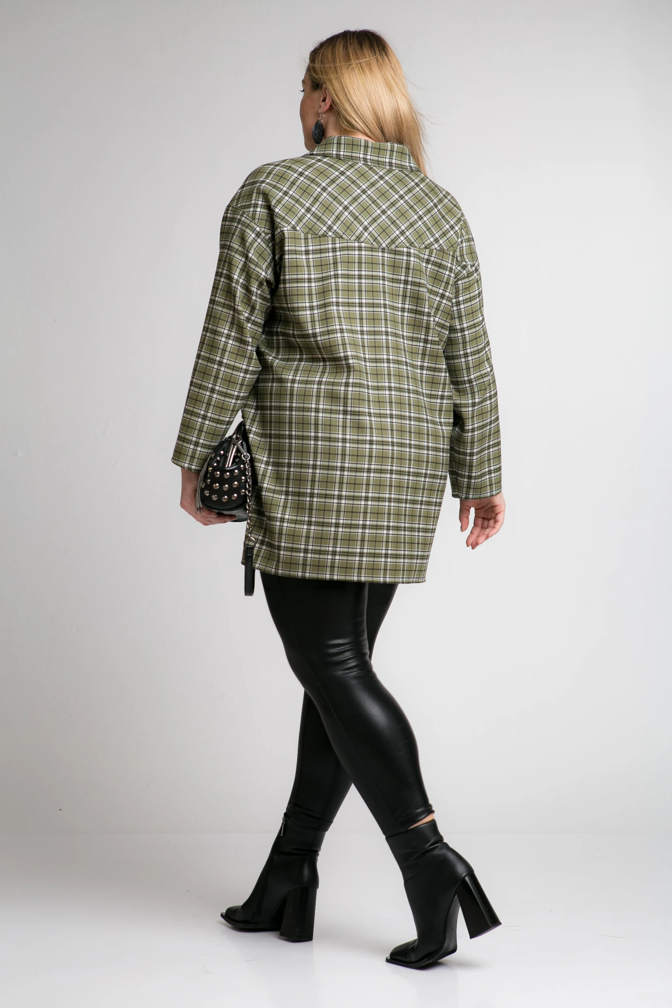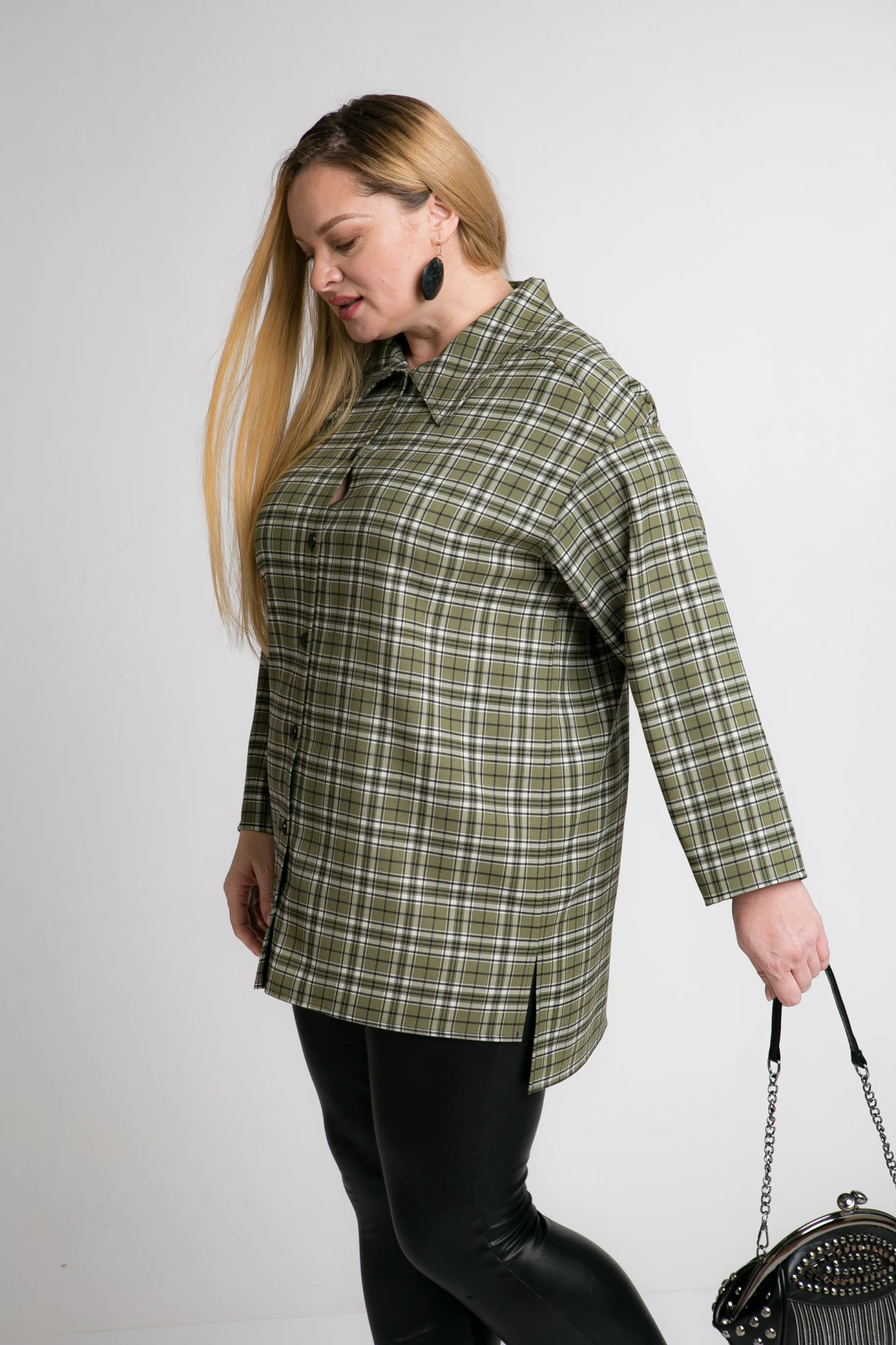Рубашка свободного кроя.Низ переда и спинки прямой, спинка чуть длиннее переда, по бокам внизу разрезы. Рубашка застегивается на петли-пуговицы. На спинке фигурная кокетка, от кокетки цельнокроеная бахрома из кожи. По всем швам выполнены отделочные строчки. Рукав рубашечный укороченный. Подойдет для носки вторым слоем(на топ, майку,лонгслив)