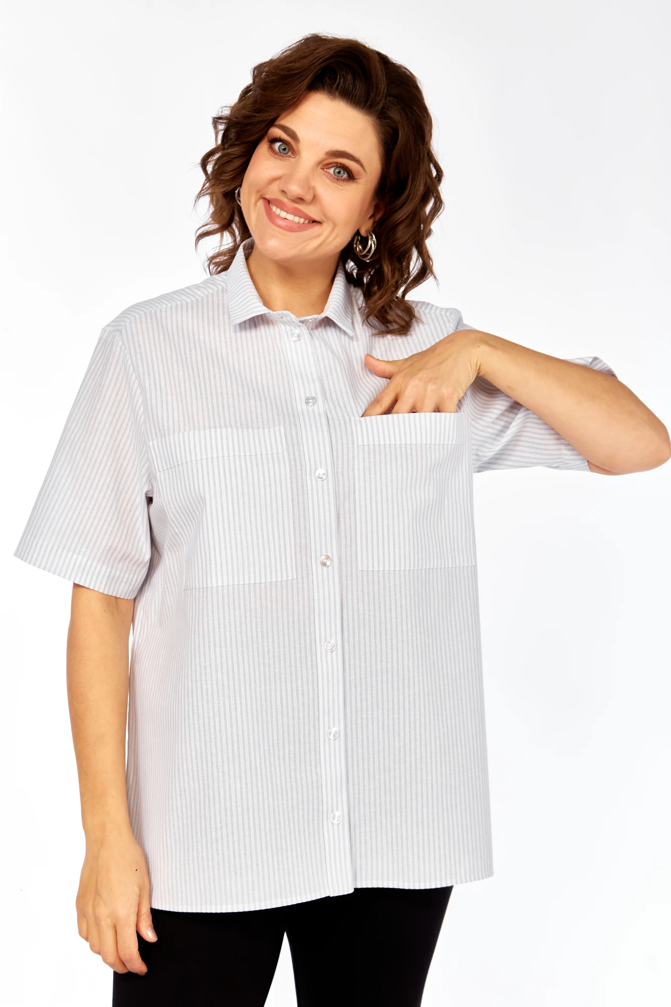 Рубашка свободного кроя, в стиле оверсайз. Силуэт свободный. На переде настрочены 2 кармана. По боковым швам разрезы. Рукав короткий. Плечо спущенное. Боковой сделан на 3см на запах,поэтому разрез не расходится.