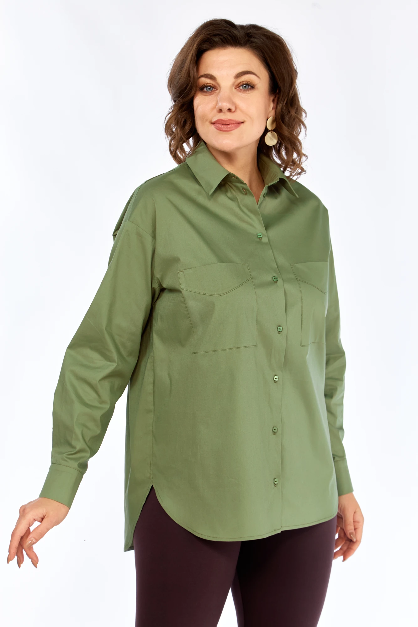 Рубашка свободного силуэта. Рукав рубашечный с разрезом и складками,заканчивается манжетой, которая застегивается на 2 петли и пуговицы.Плечо спущенное. На спинке двойная кокетка, от кокетки по центру спинки идет встречная складка. На переде вверху 2 симметричных накладных кармана. Длина по спинке(от точки основания шеи) -80см, длина по переду(от точки основания шеи)-75,5см, длина рукава+манжета-54,5см, длина плеча-21см. Ткань поплин, тянется по ширине.