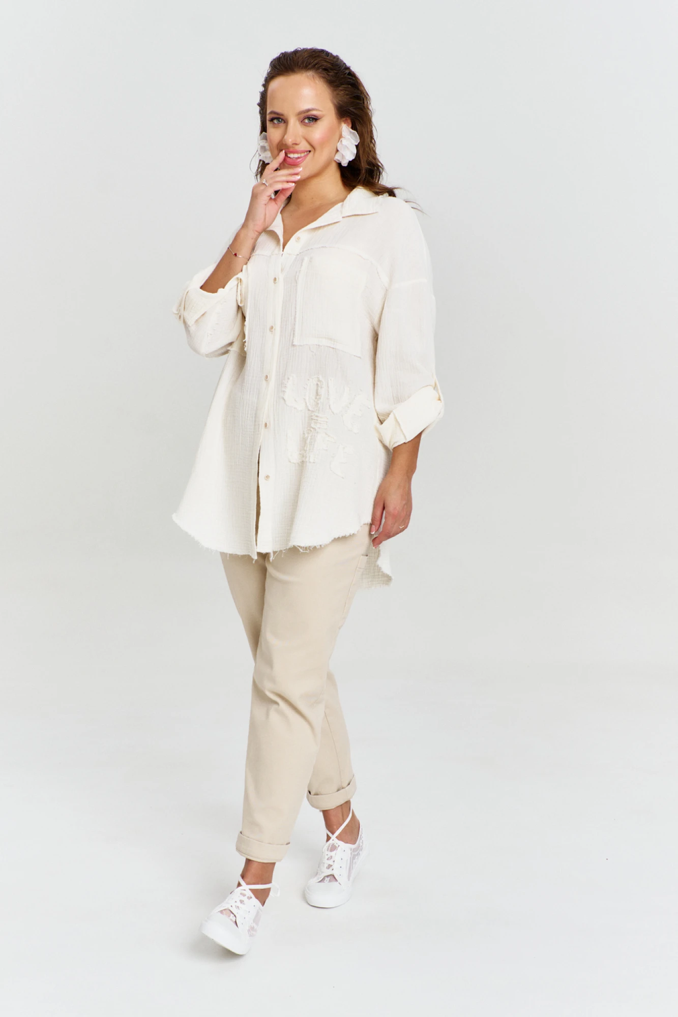 Рубашка из мягчайшего хлопкового муслина, свободного силуэта, застежкой спереди на пуговицы, длинным рукавом и рубашечным воротником. Перед с отрезной кокеткой, накладными карманами и авторскойвышивкой. Спинка с кокеткой и складкой. Рукава с манжетами, длина регулируется хлястиком. Некоторые швы необработаны, что при энзимной стирке придает изделию стильную винтажность.