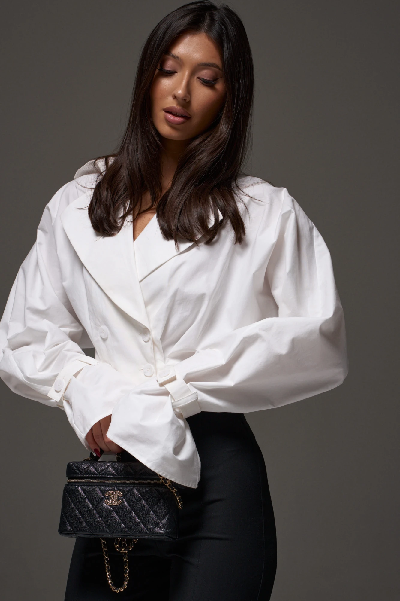 Рубашка свободного кроя, выполнена из хлопкового полотна белого цвета. Характеристики: отложной воротник с остроугольным лацканом, двубортная застежка на пуговицах, крой рукава «летучая мышь», по низу рукава пата с пуговицей, низ изделия на обтачке. Длина спинки 44 см, длина рукава от края горловины 82 см.