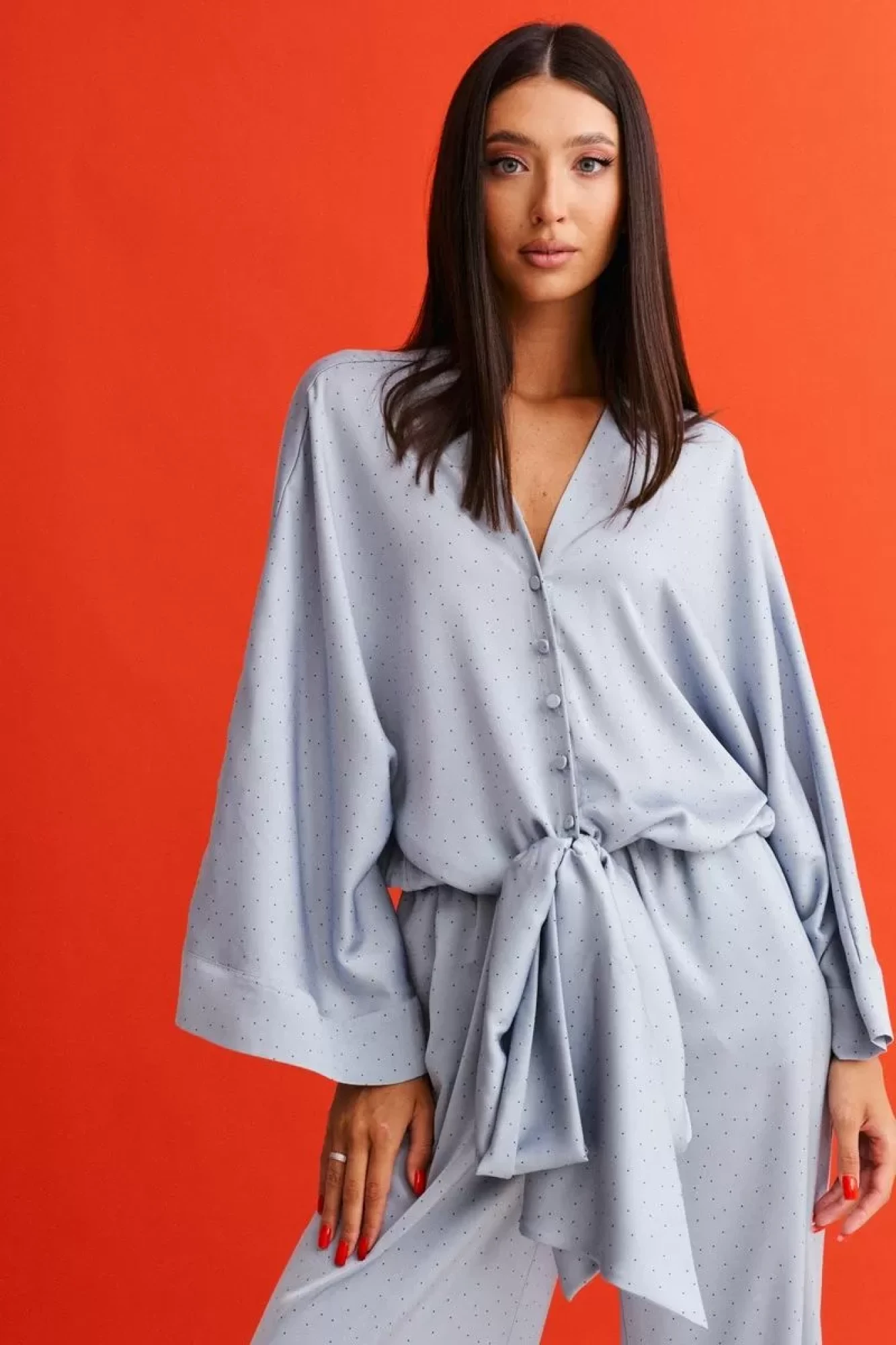 Рубашка свободного кроя с декоративными элементами выполнена из струящейся ткани. Характеристики: свободный крой, V образный вырез горловины, застежка центральная на петли пуговички, рукав свободного кроя цельнокроеный, низ изделия по передней части - стабильная вставка с декоративными удлиненными элементами которые можно завязывать на узел, на бант, по заднему полотну вставка на резинке. Длина по спинке 53 см, длина рукава от края горловины 71 см.
