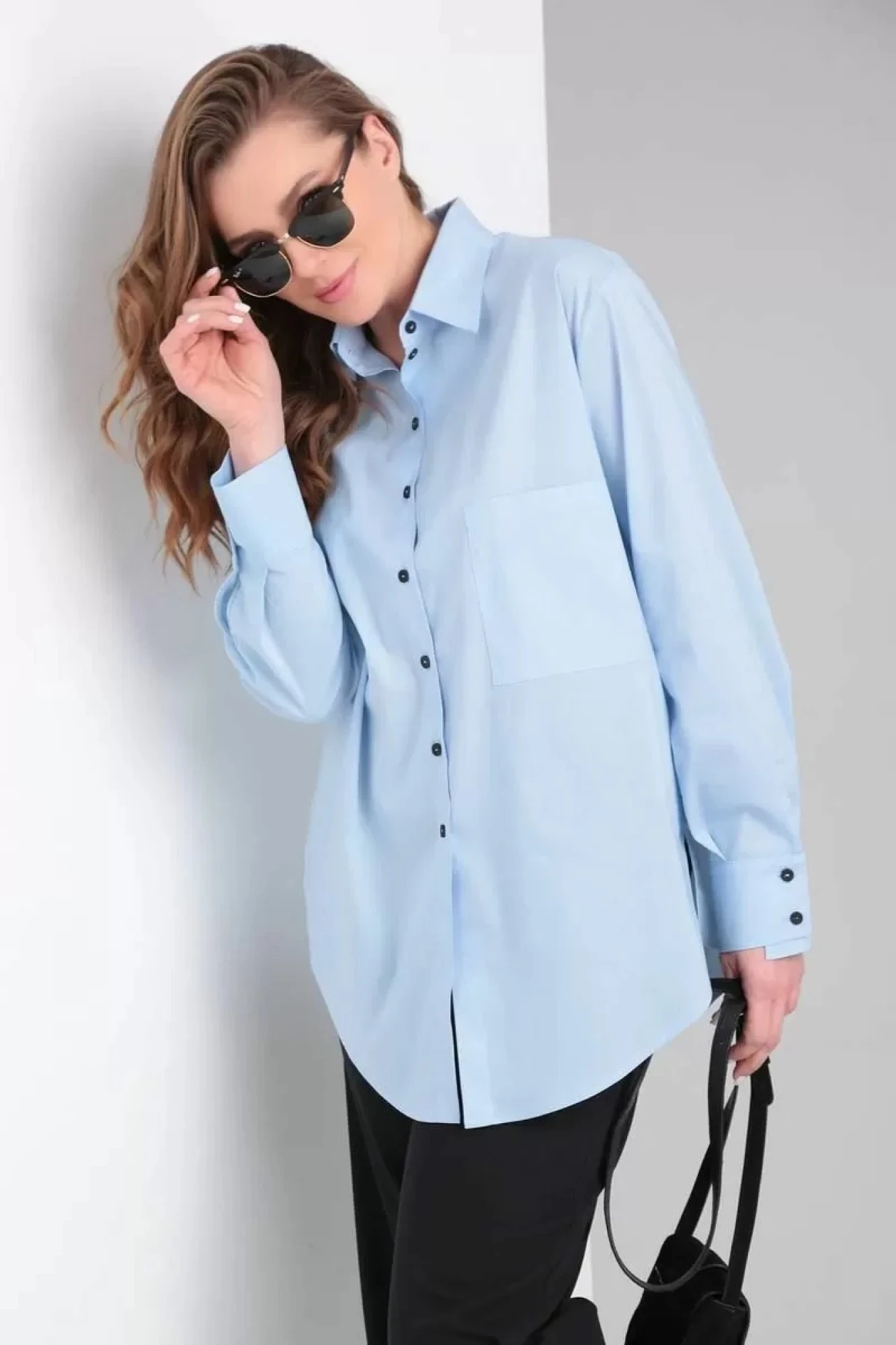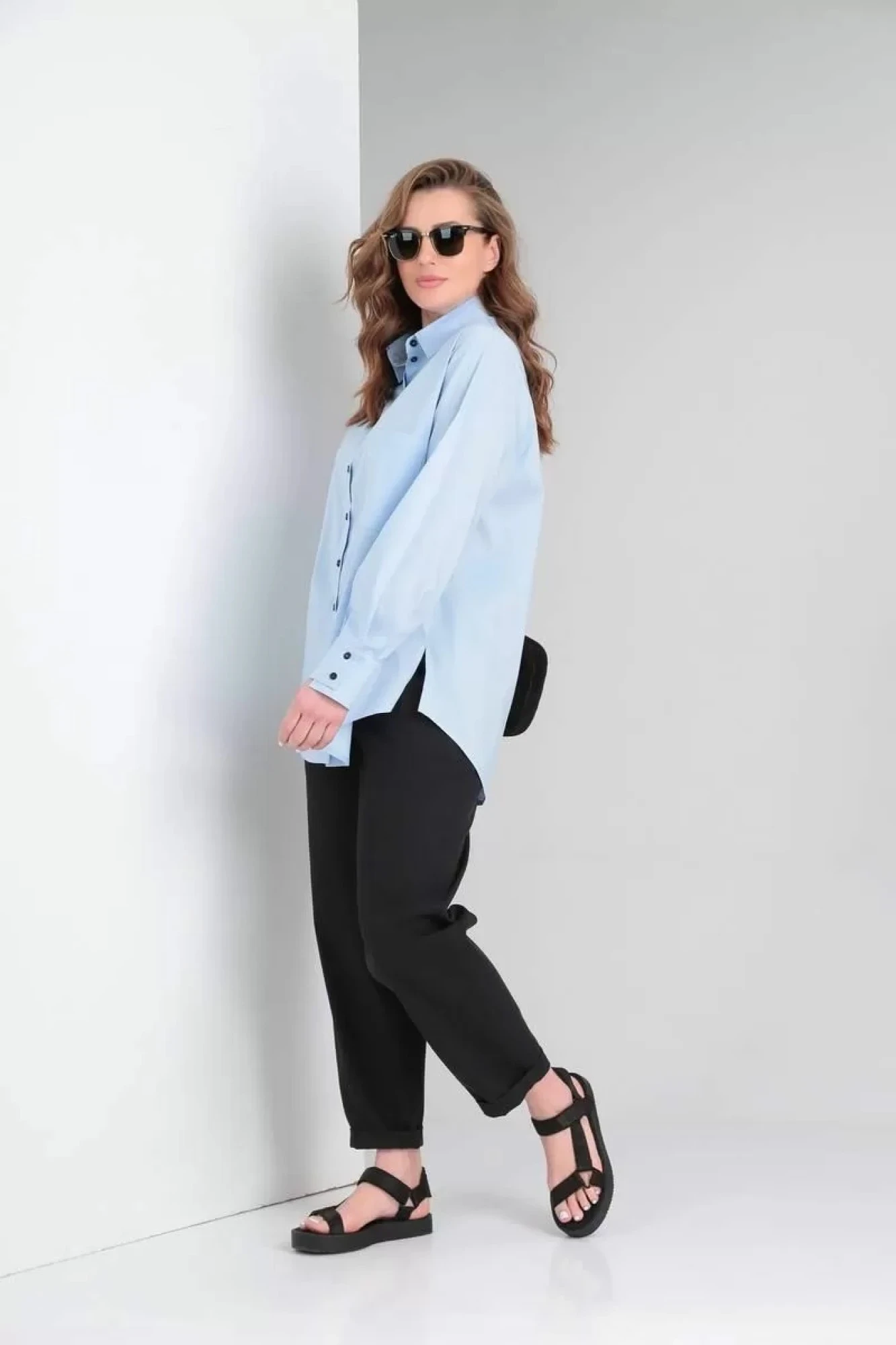 Рубашка прямого силуэта подходит под любые формы и типы фигуры. На левой полочке расположен карман. По спинке имеется кокетка с пришивными пуговицами чёрного цвета. Эффектный образ создается за счет необычных деталей и элементов. Ассиметричные манжеты и чёрные пуговицы фишка этой рубашки.