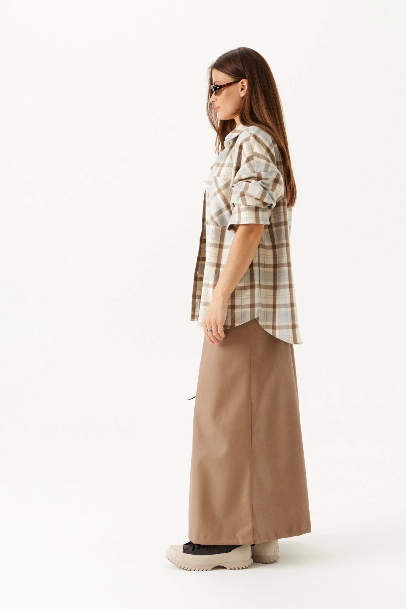 Блузка прямая, свободная, с центральной застежкой на петли и пуговицы. Воротник рубашечный, отложной, на притачной стойке. По полочкам в верхней части – симметричные накладные карманы. Спинка цельная. Боковые швы заканчиваются разрезом. Рукав втачной, длинный, с отрезной манжетой. Манжеты с застежкой на петли и пуговицы.