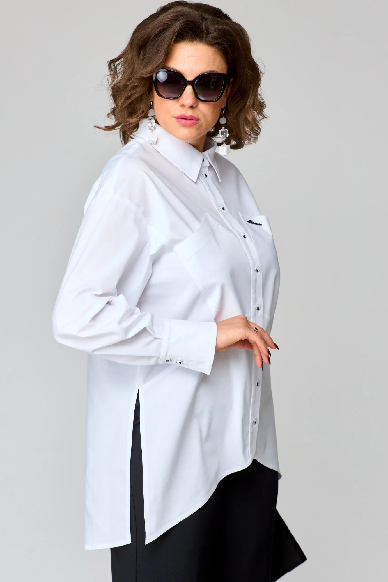 Блузк женская повседневная прямого силуэта с фигурным низом выполнена из хлопка. Вырез горловины воротник на стойке рубашечного типа, застежка доверх на обметанные петли и пговицы. Рукав спущенный, втаной на притачной манете, в боковых швах обработаны разрезы. На полочках два накладных кармана. по спинке фигурная кокетка и встречная складка. декором служат отделочные элементы, декоративные пуговицы и металличека лейба на кармане.