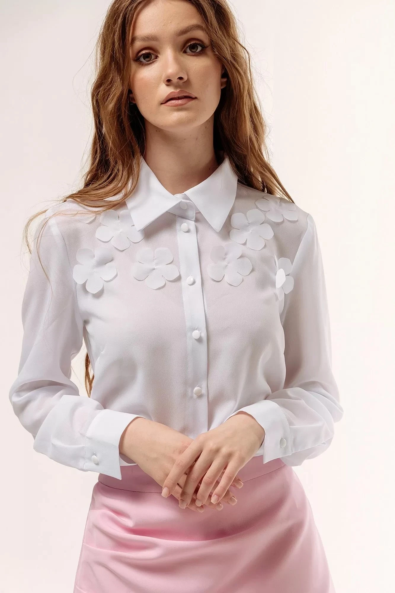 Рубашка классического кроя. Характеристики: выполнена из ткани креп-шифон в белом цвете, центральная застежка на петли и пуговицы, по полочкам декоративные цветы, низ рукава обработан манжетой на петли и пуговицы. Длина рубашки по переду 66 см, длина рукава 63 см.