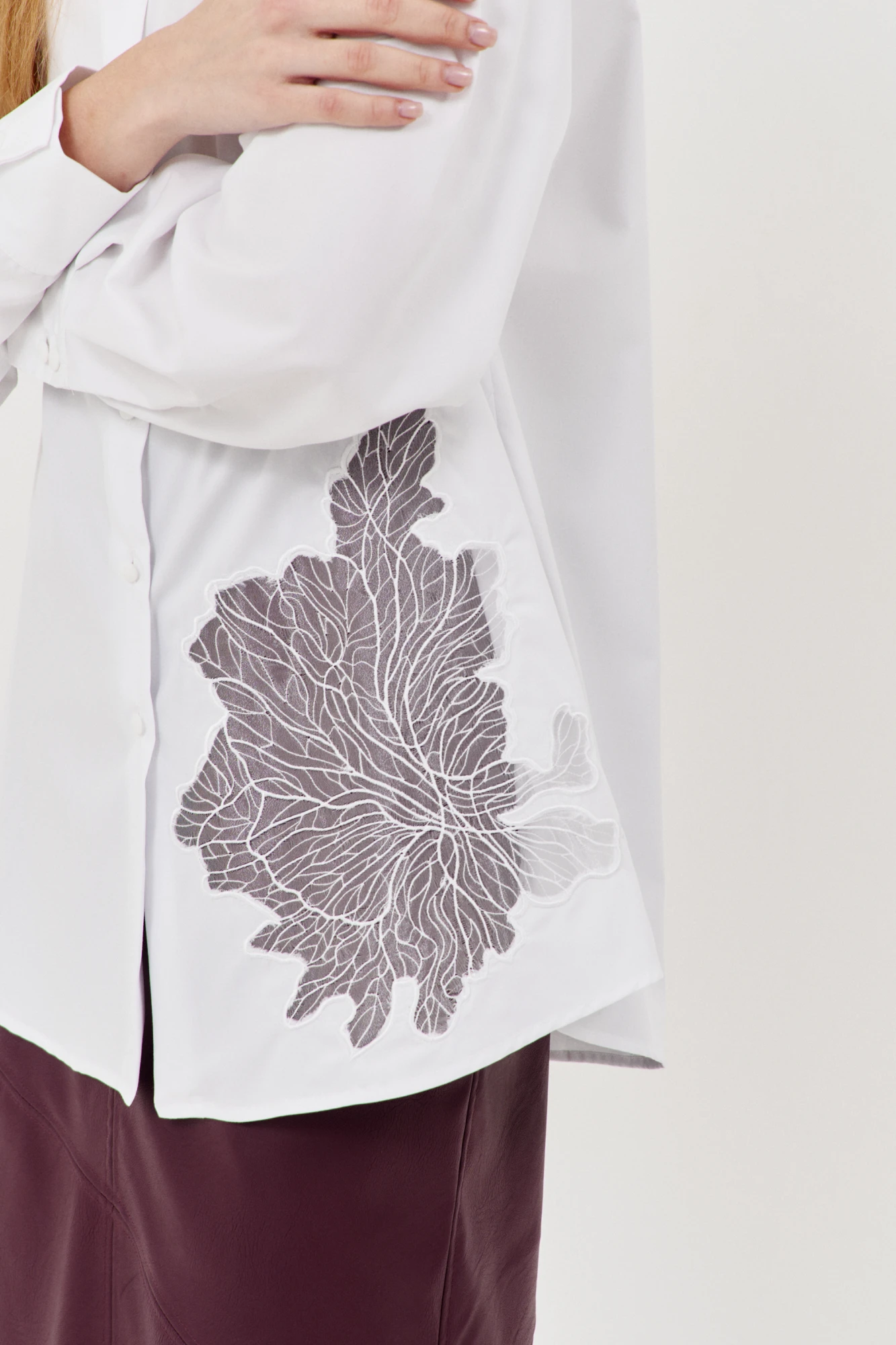 Рубашка свободного силуэта с вышивкой по переду. Характеристики: выполнена из рубашечной ткани в белом цвете, по переду декоративная вышивка, центральная застежка на петли и пуговицы, по спинке отрезная кокетка, низ рукава обработан манжетой на петли и пуговицы.